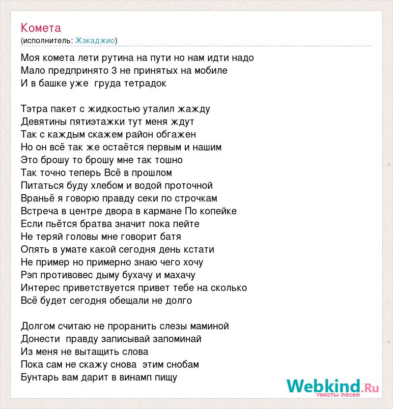 Моя комета лети рутина на пути но нам идти надо Мало предпринято 3 не принятых на мобиле И в башке уже груда тетрадок Тэтра пакет с жидкостью уталил жажду Девятины пятиэтажки тут меня ждут Так с каждым скажем район обгажен Но он всё так же остаётся первым и нашим Это брошу то брошу мне так тошно Так точно теперь Всё в прошлом Питаться буду хлебом и водой проточной Враньё я говорю правду секи по строчкам Встреча в центре двора в кармане По копейке Если пьётся братва значит пока пейте Не теряй головы мне говорит батя Опять в умате какой сегодня день кстати Не пример но примерно знаю чего хочу Рэп противовес дыму бухачу и махачу Интерес приветствуется привет тебе на сколько Всё будет сегодня обещали не долго Долгом считаю не проранить слезы маминой Донести правду записывай запоминай Из меня не вытащить слова Пока сам не скажу снова этим снобам Бунтарь вам дарит в винамп пищу