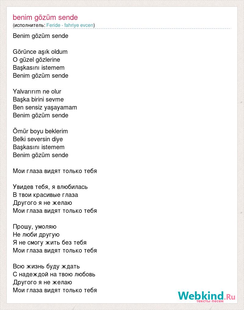 Benim gözüm sende Görünce aşık oldum O güzel gözlerine Başkasını istemem Benim gözüm sende Yalvarırım ne olur Başka birini sevme Ben sensiz yaşayamam Benim gözüm sende Ömür boyu beklerim Belki seversin diye Başkasını istemem Benim gözüm sende Мои глаза видят только тебя Увидев тебя, я влюбилась В твои красивые глаза Другого я не желаю Мои глаза видят только тебя Прошу, умоляю Не люби другую Я не смогу жить без тебя Мои глаза видят только тебя Всю жизнь буду ждать С надеждой на твою любовь Другого я не желаю Мои глаза видят только тебя