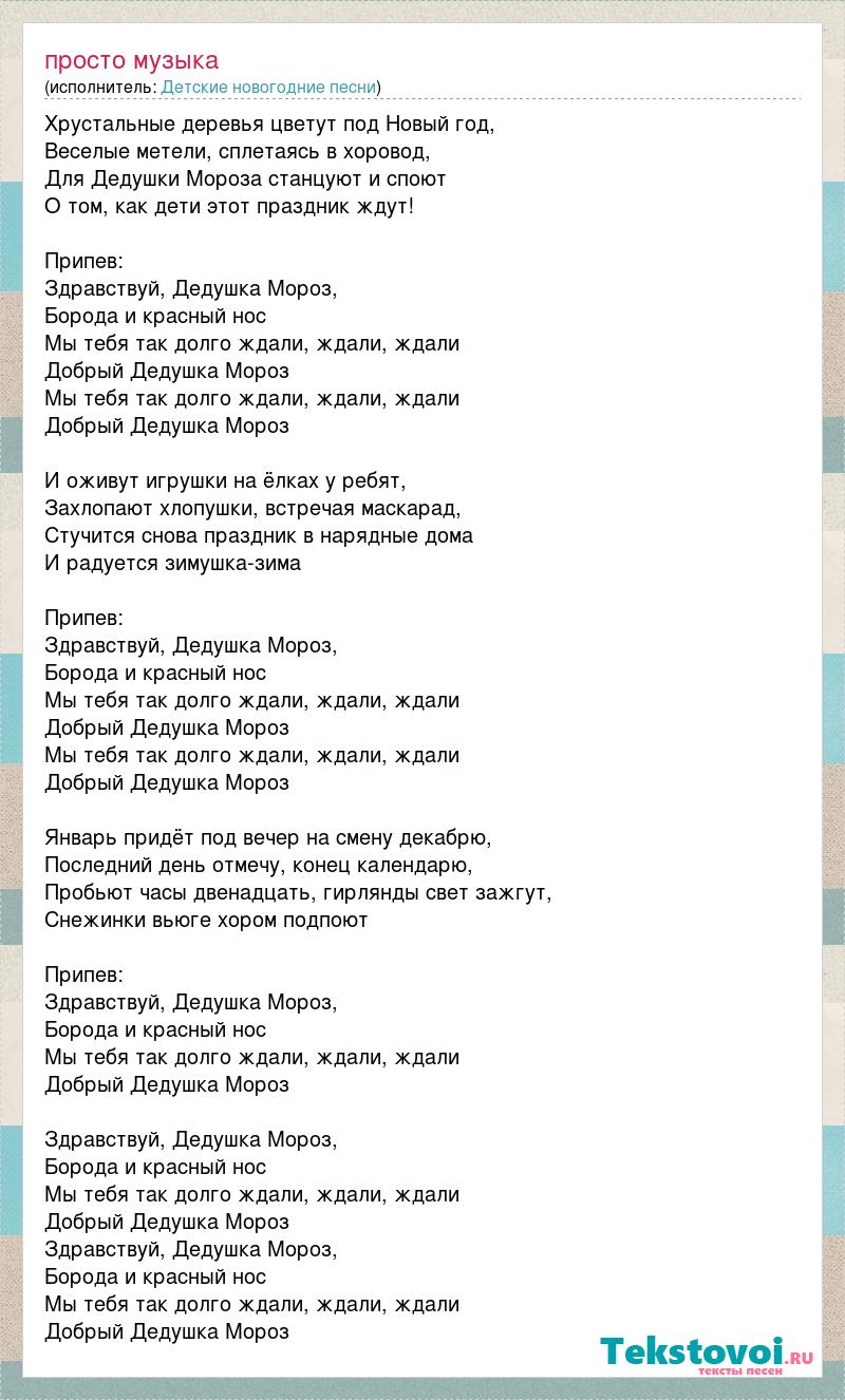 Хрустальные деревья цветут под Новый год, Веселые метели, сплетаясь в хоровод, Для Дедушки Мороза станцуют и споют О том, как дети этот праздник ждут! Припев: Здравствуй, Дедушка Мороз, Борода и красный нос Мы тебя так долго ждали, ждали, ждали Добрый Дедушка Мороз Мы тебя так долго ждали, ждали, ждали Добрый Дедушка Мороз И оживут игрушки на ёлках у ребят, Захлопают хлопушки, встречая маскарад, Стучится снова праздник в нарядные дома И радуется зимушка-зима Припев: Здравствуй, Дедушка Мороз, Борода и красный нос Мы тебя так долго ждали, ждали, ждали Добрый Дедушка Мороз Мы тебя так долго ждали, ждали, ждали Добрый Дедушка Мороз Январь придёт под вечер на смену декабрю, Последний день отмечу, конец календарю, Пробьют часы двенадцать, гирлянды свет зажгут, Снежинки вьюге хором подпоют Припев: Здравствуй, Дедушка Мороз, Борода и красный нос Мы тебя так долго ждали, ждали, ждали Добрый Дедушка Мороз Здравствуй, Дедушка Мороз, Борода и красный нос Мы тебя так долго ждали, ждали, ждали Добрый Дедушка Мороз Здравствуй, Дедушка Мороз, Борода и красный нос Мы тебя так долго ждали, ждали, ждали Добрый Дедушка Мороз