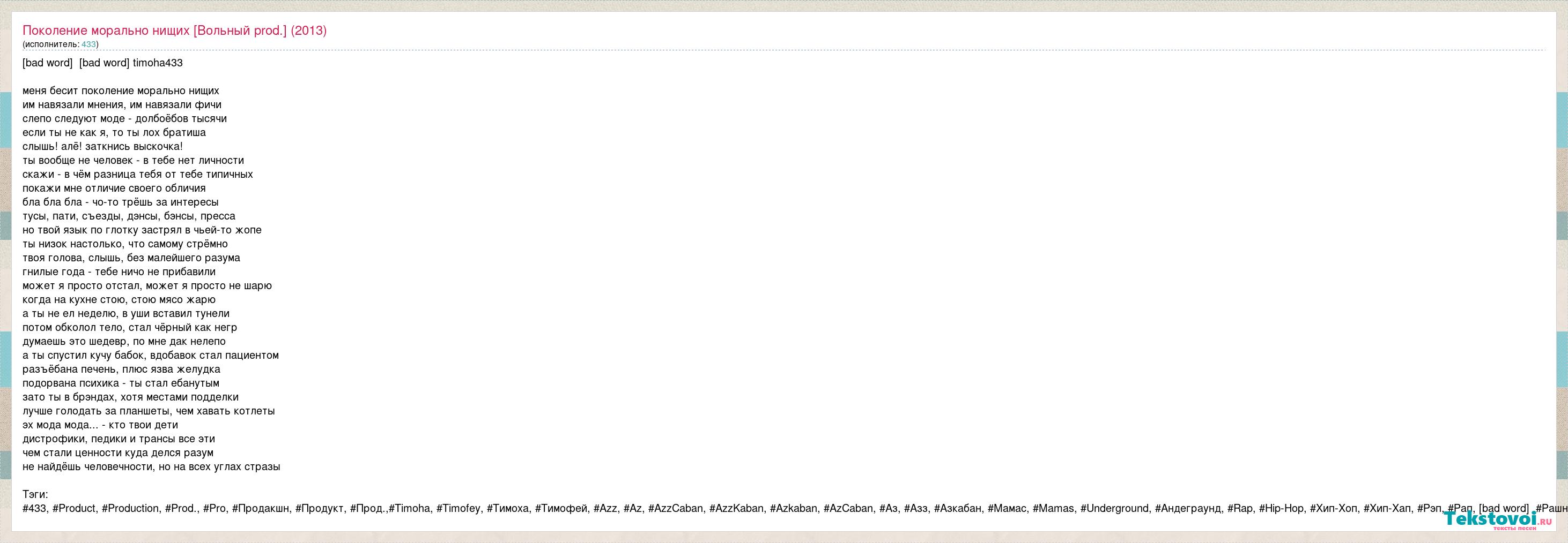 [bad word] [bad word] timoha433 меня бесит поколение морально нищих им навязали мнения, им навязали фичи слепо следуют моде - долбоёбов тысячи если ты не как я, то ты лох братиша слышь! алё! заткнись выскочка! ты вообще не человек - в тебе нет личности скажи - в чём разница тебя от тебе типичных покажи мне отличие своего обличия бла бла бла - чо-то трёшь за интересы тусы, пати, съезды, дэнсы, бэнсы, пресса но твой язык по глотку застрял в чьей-то жопе ты низок настолько, что самому стрёмно твоя голова, слышь, без малейшего разума гнилые года - тебе ничо не прибавили может я просто отстал, может я просто не шарю когда на кухне стою, стою мясо жарю а ты не ел неделю, в уши вставил тунели потом обколол тело, стал чёрный как негр думаешь это шедевр, по мне дак нелепо а ты спустил кучу бабок, вдобавок стал пациентом разъёбана печень, плюс язва желудка подорвана психика - ты стал ебанутым зато ты в брэндах, хотя местами подделки лучше голодать за планшеты, чем хавать котлеты эх мода мода... - кто твои дети дистрофики, педики и трансы все эти чем стали ценности куда делся разум не найдёшь человечности, но на всех углах стразы Тэги: #433, #Product, #Production, #Prod., #Pro, #Продакшн, #Продукт, #Прод.,#Timoha, #Timofey, #Тимоха, #Тимофей, #Azz, #Az, #AzzCaban, #AzzKaban, #Azkaban, #AzCaban, #Аз, #Азз, #Азкабан, #Мамас, #Mamas, #Underground, #Андеграунд, #Rap, #Hip-Hop, #Хип-Хоп, #Хип-Хап, #Рэп, #Рап, [bad word] #Рашн