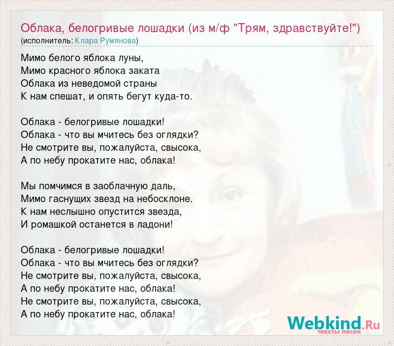 Мимо белого яблока луны, Мимо красного яблока заката Облака из неведомой страны К нам спешат, и опять бегут куда-то. Облака - белогривые лошадки! Облака - что вы мчитесь без оглядки? Не смотрите вы, пожалуйста, свысока, А по небу прокатите нас, облака! Мы помчимся в заоблачную даль, Мимо гаснущих звезд на небосклоне. К нам неслышно опустится звезда, И ромашкой останется в ладони! Облака - белогривые лошадки! Облака - что вы мчитесь без оглядки? Не смотрите вы, пожалуйста, свысока, А по небу прокатите нас, облака! Не смотрите вы, пожалуйста, свысока, А по небу прокатите нас, облака!