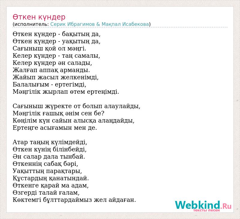 Өткен күндер - бақытың да, Өткен күндер - уақытың да, Сағыныш қой ол мәңгі. Келер күндер - таң самалы, Келер күндер ән салады, Жалғап аппақ арманды. Жайып жасыл желкенімді, Балалығым - ертегімді, Мәңгілік жырлап өтем ертеңімді. Сағыныш жүректе от болып алаулайды, Мәңгілік ғашық әнім сен бе? Көңілім күн сайын алысқа алаңдайды, Ертеңге асығамын мен де. Атар таңың күлімдейді, Өткен күнің білінбейді, Ән салар дала тынбай. Өткеннің сабақ бәрі, Уақыттың парақтары, Құстардың қанатындай. Өткенге қарай ма адам, Өзгерді талай ғалам, Көктемгі бұлттардаймыз жел айдаған.