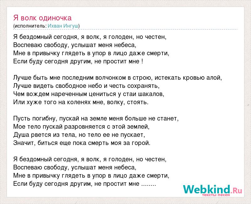 Я бездомный сегодня, я волк, я голоден, но честен, Воспеваю свободу, услышат меня небеса, Мне в привычку глядеть в упор в лицо даже смерти, Если буду сегодня другим, не простит мне ! Лучше быть мне последним волчонком в строю, истекать кровью алой, Лучше видеть свободное небо и честь сохранять, Чем вождем нареченным цениться у стаи шакалов, Или хуже того на коленях мне, волку, стоять. Пусть погибну, пускай на земле меня больше не станет, Мое тело пускай разровняется с этой землей, Душа рвется из тела, но тело ее не пускает, Значит, биться еще пока смерть моя за горой. Я бездомный сегодня, я волк, я голоден, но честен, Воспеваю свободу, услышат меня небеса, Мне в привычку глядеть в упор в лицо даже смерти, Если буду сегодня другим, не простит мне ........
