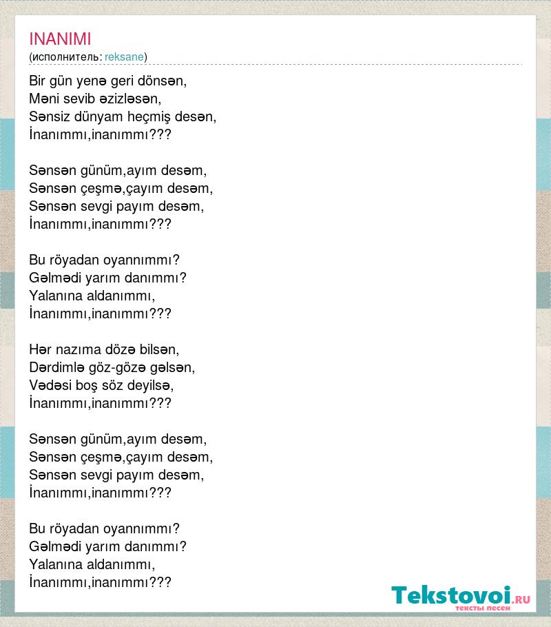 Bir gün yenə geri dönsən, Məni sevib əzizləsən, Sənsiz dünyam heçmiş desən, İnanımmı,inanımmı??? Sənsən günüm,ayım desəm, Sənsən çeşmə,çayım desəm, Sənsən sevgi payım desəm, İnanımmı,inanımmı??? Bu röyadan oyannımmı? Gəlmədi yarım danımmı? Yalanına aldanımmı, İnanımmı,inanımmı??? Hər nazıma dözə bilsən, Dərdimlə göz-gözə gəlsən, Vədəsi boş söz deyilsə, İnanımmı,inanımmı??? Sənsən günüm,ayım desəm, Sənsən çeşmə,çayım desəm, Sənsən sevgi payım desəm, İnanımmı,inanımmı??? Bu röyadan oyannımmı? Gəlmədi yarım danımmı? Yalanına aldanımmı, İnanımmı,inanımmı???