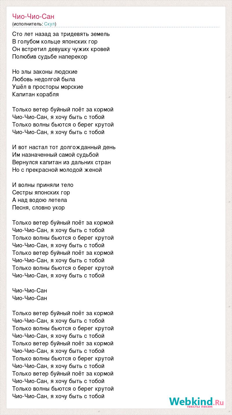 Сто лет назад за тридевять земель В голубом кольце японских гор Он встретил девушку чужих кровей Полюбив судьбе наперекор Но злы законы людские Любовь недолгой была Ушёл в просторы морские Капитан корабля Только ветер буйный поёт за кормой Чио-Чио-Сан, я хочу быть с тобой Только волны бьются о берег крутой Чио-Чио-Сан, я хочу быть с тобой И вот настал тот долгожданный день Им назначенный самой судьбой Вернулся капитан из дальних стран Но с прекрасной молодой женой И волны приняли тело Сестры японских гор А над водою летела Песня, словно укор Только ветер буйный поёт за кормой Чио-Чио-Сан, я хочу быть с тобой Только волны бьются о берег крутой Чио-Чио-Сан, я хочу быть с тобой Только ветер буйный поёт за кормой Чио-Чио-Сан, я хочу быть с тобой Только волны бьются о берег крутой Чио-Чио-Сан, я хочу быть с тобой Чио-Чио-Сан Чио-Чио-Сан Только ветер буйный поёт за кормой Чио-Чио-Сан, я хочу быть с тобой Только волны бьются о берег крутой Чио-Чио-Сан, я хочу быть с тобой Только ветер буйный поёт за кормой Чио-Чио-Сан, я хочу быть с тобой Только волны бьются о берег крутой Чио-Чио-Сан, я хочу быть с тобой Только ветер буйный поёт за кормой Чио-Чио-Сан, я хочу быть с тобой Только волны бьются о берег крутой Чио-Чио-Сан, я хочу быть с тобой