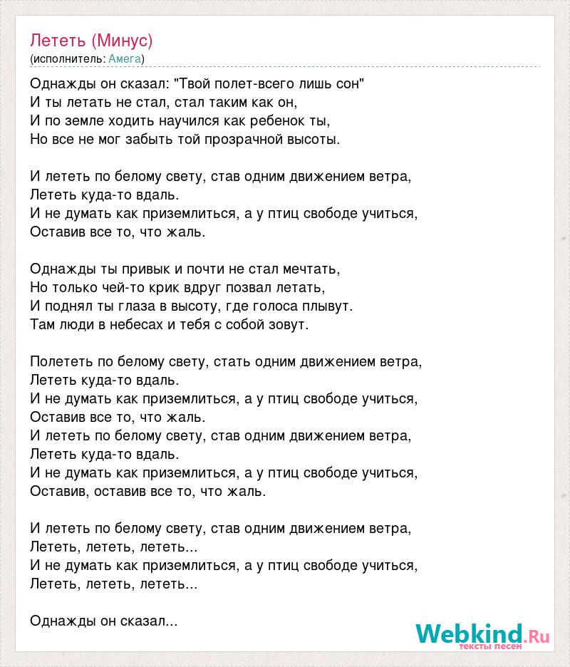 Однажды он сказал: "Твой полет-всего лишь сон" И ты летать не стал, стал таким как он, И по земле ходить научился как ребенок ты, Но все не мог забыть той прозрачной высоты. И лететь по белому свету, став одним движением ветра, Лететь куда-то вдаль. И не думать как приземлиться, а у птиц свободе учиться, Оставив все то, что жаль. Однажды ты привык и почти не стал мечтать, Но только чей-то крик вдруг позвал летать, И поднял ты глаза в высоту, где голоса плывут. Там люди в небесах и тебя с собой зовут. Полететь по белому свету, стать одним движением ветра, Лететь куда-то вдаль. И не думать как приземлиться, а у птиц свободе учиться, Оставив все то, что жаль. И лететь по белому свету, став одним движением ветра, Лететь куда-то вдаль. И не думать как приземлиться, а у птиц свободе учиться, Оставив, оставив все то, что жаль. И лететь по белому свету, став одним движением ветра, Лететь, лететь, лететь... И не думать как приземлиться, а у птиц свободе учиться, Лететь, лететь, лететь... Однажды он сказал...