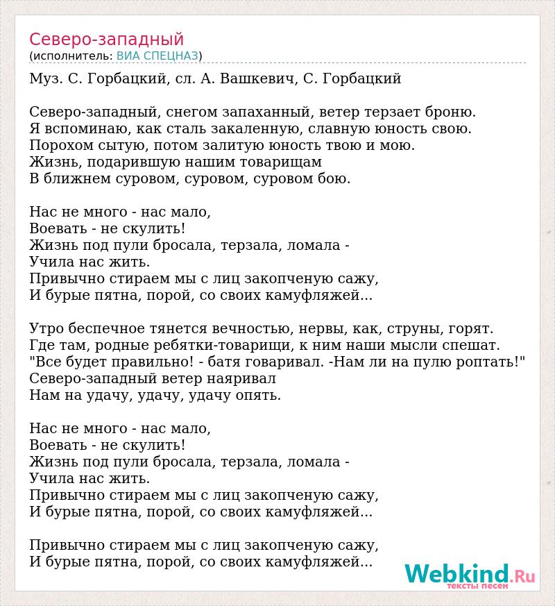 Муз. С. Горбацкий, сл. А. Вашкевич, С. Горбацкий Северо-западный, снегом запаханный, ветер терзает броню. Я вспоминаю, как сталь закаленную, славную юность свою. Порохом сытую, потом залитую юность твою и мою. Жизнь, подарившую нашим товарищам В ближнем суровом, суровом, суровом бою. Нас не много - нас мало, Воевать - не скулить! Жизнь под пули бросала, терзала, ломала - Учила нас жить. Привычно стираем мы с лиц закопченую сажу, И бурые пятна, порой, со своих камуфляжей... Утро беспечное тянется вечностью, нервы, как, струны, горят. Где там, родные ребятки-товарищи, к ним наши мысли спешат. "Все будет правильно! - батя говаривал. -Нам ли на пулю роптать!" Северо-западный ветер наяривал Нам на удачу, удачу, удачу опять. Нас не много - нас мало, Воевать - не скулить! Жизнь под пули бросала, терзала, ломала - Учила нас жить. Привычно стираем мы с лиц закопченую сажу, И бурые пятна, порой, со своих камуфляжей... Привычно стираем мы с лиц закопченую сажу, И бурые пятна, порой, со своих камуфляжей...