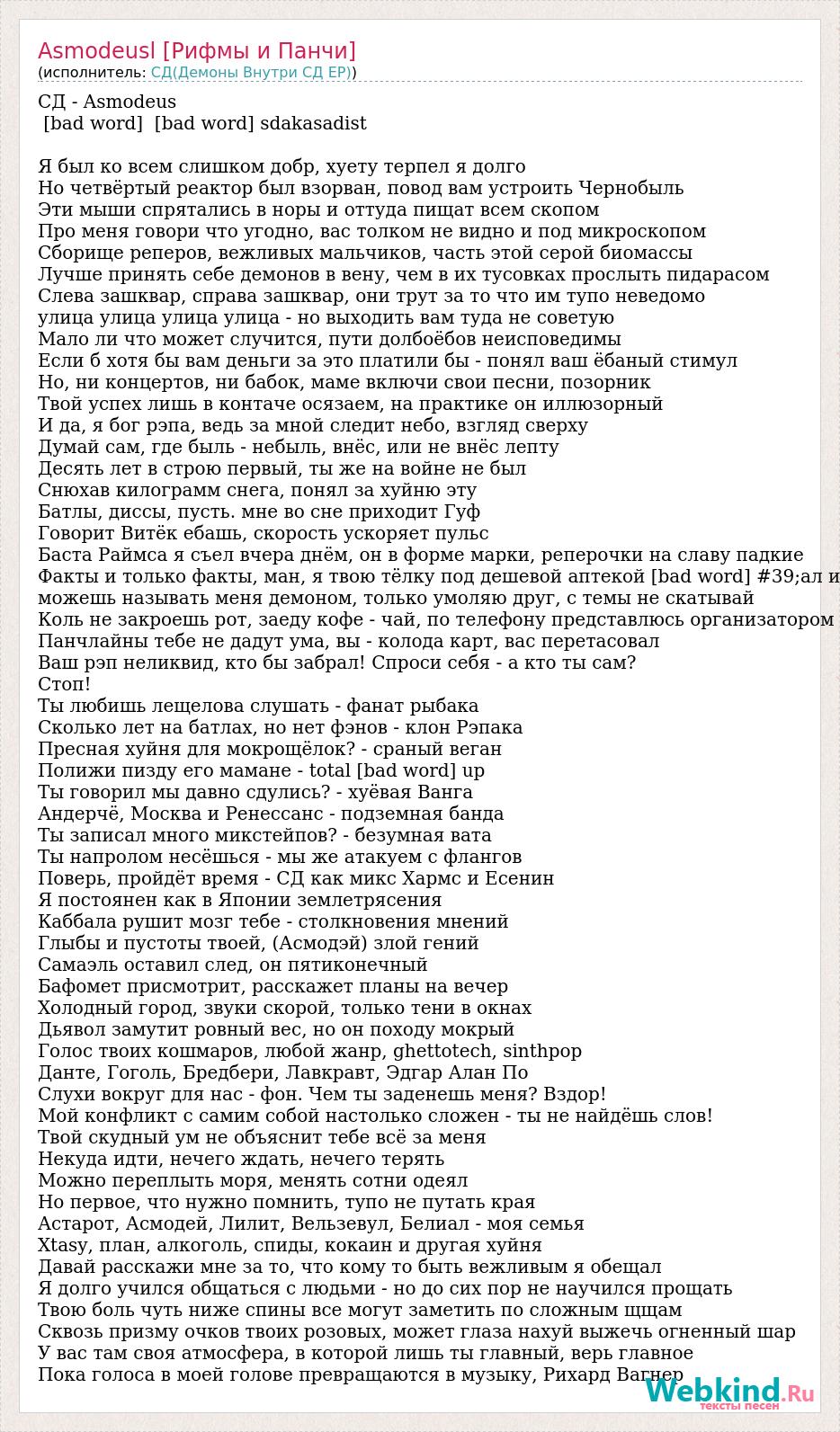 СД - Asmodeus [bad word] [bad word] sdakasadist Я был ко всем слишком добр, хуету терпел я долго Но четвёртый реактор был взорван, повод вам устроить Чернобыль Эти мыши спрятались в норы и оттуда пищат всем скопом Про меня говори что угодно, вас толком не видно и под микроскопом Сборище реперов, вежливых мальчиков, часть этой серой биомассы Лучше принять себе демонов в вену, чем в их тусовках прослыть пидарасом Слева зашквар, справа зашквар, они трут за то что им тупо неведомо улица улица улица улица - но выходить вам туда не советую Мало ли что может случится, пути долбоёбов неисповедимы Если б хотя бы вам деньги за это платили бы - понял ваш ёбаный стимул Но, ни концертов, ни бабок, маме включи свои песни, позорник Твой успех лишь в контаче осязаем, на практике он иллюзорный И да, я бог рэпа, ведь за мной следит небо, взгляд сверху Думай сам, где быль - небыль, внёс, или не внёс лепту Десять лет в строю первый, ты же на войне не был Снюхав килограмм снега, понял за хуйню эту Батлы, диссы, пусть. мне во сне приходит Гуф Говорит Витёк ебашь, скорость ускоряет пульс Баста Раймса я съел вчера днём, он в форме марки, реперочки на славу падкие Факты и только факты, ман, я твою тёлку под дешевой аптекой [bad word] #39;ал и можешь называть меня демоном, только умоляю друг, с темы не скатывай Коль не закроешь рот, заеду кофе - чай, по телефону представлюсь организатором Панчлайны тебе не дадут ума, вы - колода карт, вас перетасовал Ваш рэп неликвид, кто бы забрал! Спроси себя - а кто ты сам? Стоп! Ты любишь лещелова слушать - фанат рыбака Сколько лет на батлах, но нет фэнов - клон Рэпака Пресная хуйня для мокрощёлок? - сраный веган Полижи пизду его мамане - total [bad word] up Ты говорил мы давно сдулись? - хуёвая Ванга Андерчё, Москва и Ренессанс - подземная банда Ты записал много микстейпов? - безумная вата Ты напролом несёшься - мы же атакуем с флангов Поверь, пройдёт время - СД как микс Хармс и Есенин Я постоянен как в Японии землетрясения Каббала рушит мозг тебе - столкновения мнений Глыбы и пустоты твоей, (Асмодэй) злой гений Самаэль оставил след, он пятиконечный Бафомет присмотрит, расскажет планы на вечер Холодный город, звуки скорой, только тени в окнах Дьявол замутит ровный вес, но он походу мокрый Голос твоих кошмаров, любой жанр, ghettotech, sinthpop Данте, Гоголь, Бредбери, Лавкравт, Эдгар Алан По Слухи вокруг для нас - фон. Чем ты заденешь меня? Вздор! Мой конфликт с самим собой настолько сложен - ты не найдёшь слов! Твой скудный ум не объяснит тебе всё за меня Некуда идти, нечего ждать, нечего терять Можно переплыть моря, менять сотни одеял Но первое, что нужно помнить, тупо не путать края Астарот, Асмодей, Лилит, Вельзевул, Белиал - моя семья Xtasy, план, алкоголь, спиды, кокаин и другая хуйня Давай расскажи мне за то, что кому то быть вежливым я обещал Я долго учился общаться с людьми - но до сих пор не научился прощать Твою боль чуть ниже спины все могут заметить по сложным щщам Сквозь призму очков твоих розовых, может глаза нахуй выжечь огненный шар У вас там своя атмосфера, в которой лишь ты главный, верь главное Пока голоса в моей голове превращаются в музыку, Рихард Вагнер