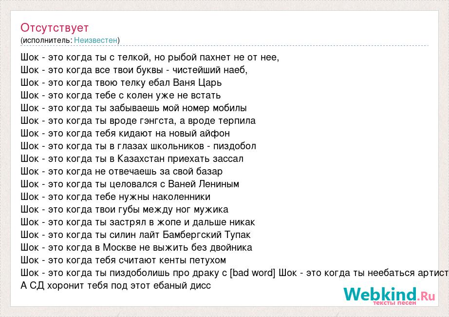 Шок - это когда ты с телкой, но рыбой пахнет не от нее, Шок - это когда все твои буквы - чистейший наеб, Шок - это когда твою телку ебал Ваня Царь Шок - это когда тебе с колен уже не встать Шок - это когда ты забываешь мой номер мобилы Шок - это когда ты вроде гэнгста, а вроде терпила Шок - это когда тебя кидают на новый айфон Шок - это когда ты в глазах школьников - пиздобол Шок - это когда ты в Казахстан приехать зассал Шок - это когда не отвечаешь за свой базар Шок - это когда ты целовался с Ваней Лениным Шок - это когда тебе нужны наколенники Шок - это когда твои губы между ног мужика Шок - это когда ты застрял в жопе и дальше никак Шок - это когда ты силин лайт Бамбергский Тупак Шок - это когда в Москве не выжить без двойника Шок - это когда тебя считают кенты петухом Шок - это когда ты пиздоболишь про драку с [bad word] Шок - это когда ты неебаться артист А СД хоронит тебя под этот ебаный дисс