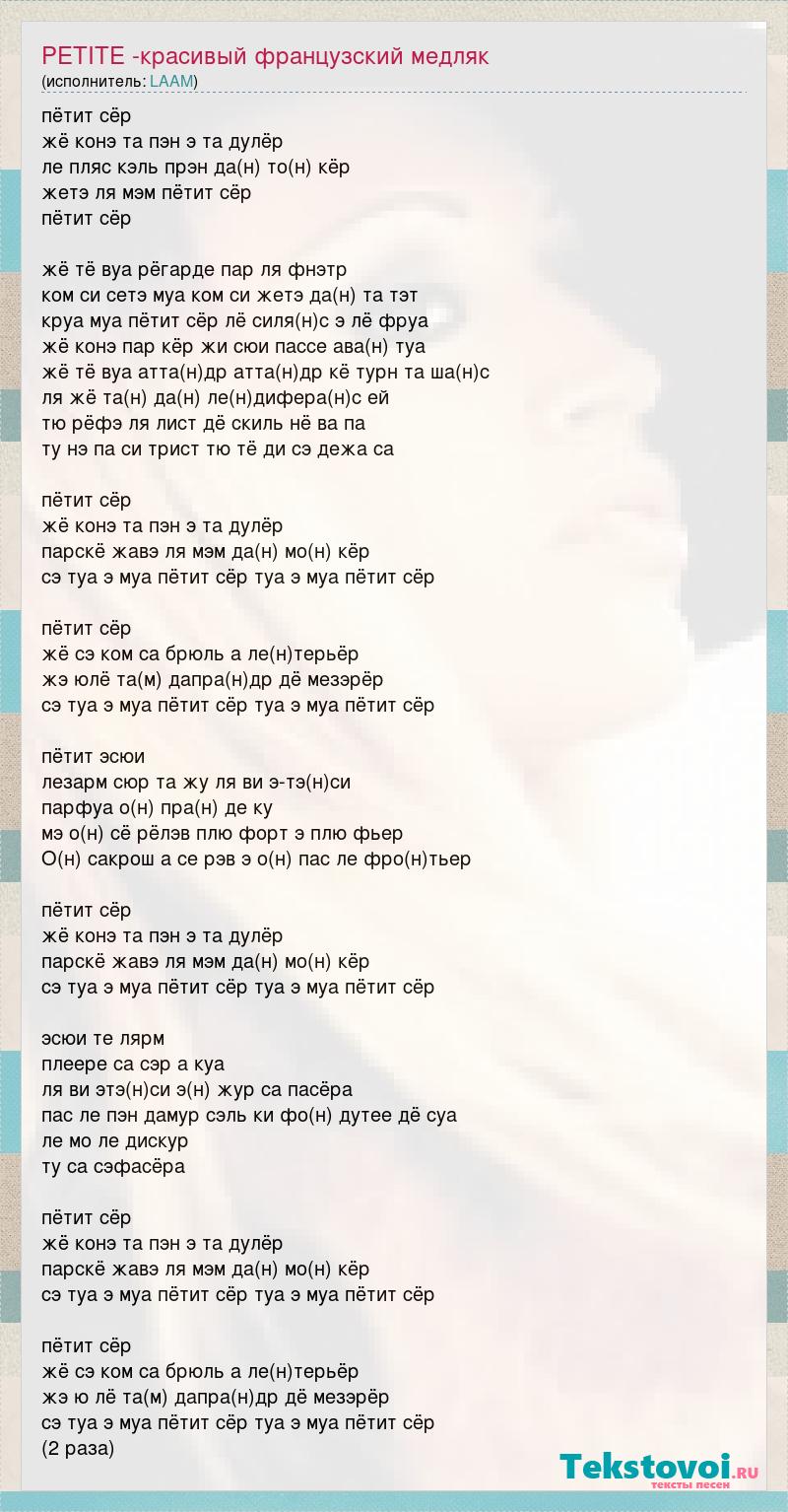 пётит сёр жё конэ та пэн э та дулёр ле пляс кэль прэн да(н) то(н) кёр жетэ ля мэм пётит сёр пётит сёр жё тё вуа рёгарде пар ля фнэтр ком си сетэ муа ком си жетэ да(н) та тэт круа муа пётит сёр лё силя(н)с э лё фруа жё конэ пар кёр жи сюи пассе ава(н) туа жё тё вуа атта(н)др атта(н)др кё турн та ша(н)с ля жё та(н) да(н) ле(н)дифера(н)с ей тю рёфэ ля лист дё скиль нё ва па ту нэ па си трист тю тё ди сэ дежа са пётит сёр жё конэ та пэн э та дулёр парскё жавэ ля мэм да(н) мо(н) кёр сэ туа э муа пётит сёр туа э муа пётит сёр пётит сёр жё сэ ком са брюль а ле(н)терьёр жэ юлё та(м) дапра(н)др дё мезэрёр сэ туа э муа пётит сёр туа э муа пётит сёр пётит эсюи лезарм сюр та жу ля ви э-тэ(н)си парфуа о(н) пра(н) де ку мэ о(н) сё рёлэв плю форт э плю фьер О(н) сакрош а се рэв э о(н) пас ле фро(н)тьер пётит сёр жё конэ та пэн э та дулёр парскё жавэ ля мэм да(н) мо(н) кёр сэ туа э муа пётит сёр туа э муа пётит сёр эсюи те лярм плеере са сэр а куа ля ви этэ(н)си э(н) жур са пасёра пас ле пэн дамур сэль ки фо(н) дутее дё суа ле мо ле дискур ту са сэфасёра пётит сёр жё конэ та пэн э та дулёр парскё жавэ ля мэм да(н) мо(н) кёр сэ туа э муа пётит сёр туа э муа пётит сёр пётит сёр жё сэ ком са брюль а ле(н)терьёр жэ ю лё та(м) дапра(н)др дё мезэрёр сэ туа э муа пётит сёр туа э муа пётит сёр (2 раза)