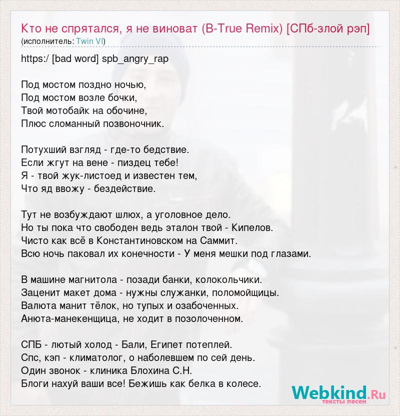 А как ты думаешь, о чем песня "Кто не спрятался, я не виноват (B-True Remix) [СПб-злой рэп]" ?
