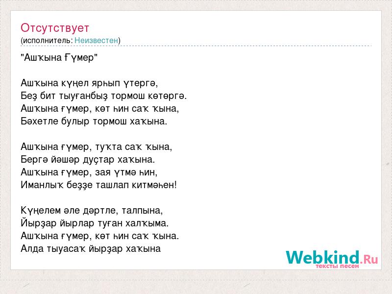 "Ашҡына Ғүмер" Ашҡына күңел ярһып үтергә, Беҙ бит тыуғанбыҙ тормош көтөргә. Ашҡына ғүмер, көт һин саҡ ҡына, Бәхетле булыр тормош хаҡына. Ашҡына ғүмер, туҡта саҡ ҡына, Бергә йәшәр дуҫтар хаҡына. Ашҡына ғүмер, зая үтмә һин, Иманлыҡ беҙҙе ташлап китмәһен! Күңелем әле дәртле, талпына, Йырҙар йырлар туған халҡыма. Ашҡына ғүмер, көт һин саҡ ҡына. Алда тыуасаҡ йырҙар хаҡына