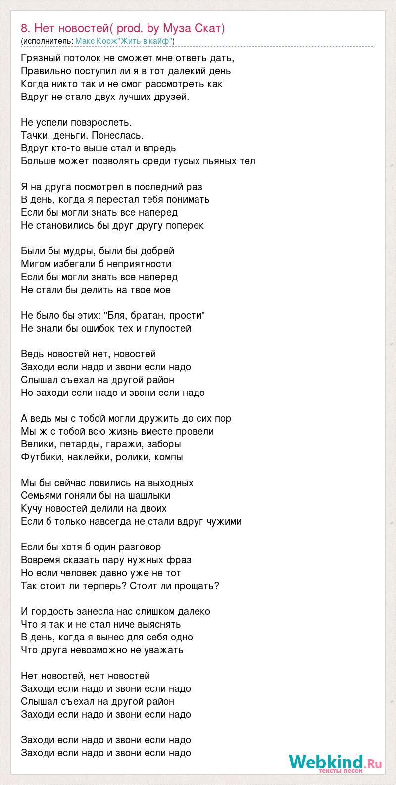 Грязный потолок не сможет мне ответь дать, Правильно поступил ли я в тот далекий день Когда никто так и не смог рассмотреть как Вдруг не стало двух лучших друзей. Не успели повзрослеть. Тачки, деньги. Понеслась. Вдруг кто-то выше стал и впредь Больше может позволять среди тусых пьяных тел Я на друга посмотрел в последний раз В день, когда я перестал тебя понимать Если бы могли знать все наперед Не становились бы друг другу поперек Были бы мудры, были бы добрей Мигом избегали б неприятности Если бы могли знать все наперед Не стали бы делить на твое мое Не было бы этих: "Бля, братан, прости" Не знали бы ошибок тех и глупостей Ведь новостей нет, новостей Заходи если надо и звони если надо Слышал съехал на другой район Но заходи если надо и звони если надо А ведь мы с тобой могли дружить до сих пор Мы ж с тобой всю жизнь вместе провели Велики, петарды, гаражи, заборы Футбики, наклейки, ролики, компы Мы бы сейчас ловились на выходных Семьями гоняли бы на шашлыки Кучу новостей делили на двоих Если б только навсегда не стали вдруг чужими Если бы хотя б один разговор Вовремя сказать пару нужных фраз Но если человек давно уже не тот Так стоит ли терперь? Стоит ли прощать? И гордость занесла нас слишком далеко Что я так и не стал ниче выяснять В день, когда я вынес для себя одно Что друга невозможно не уважать Нет новостей, нет новостей Заходи если надо и звони если надо Слышал съехал на другой район Заходи если надо и звони если надо Заходи если надо и звони если надо Заходи если надо и звони если надо