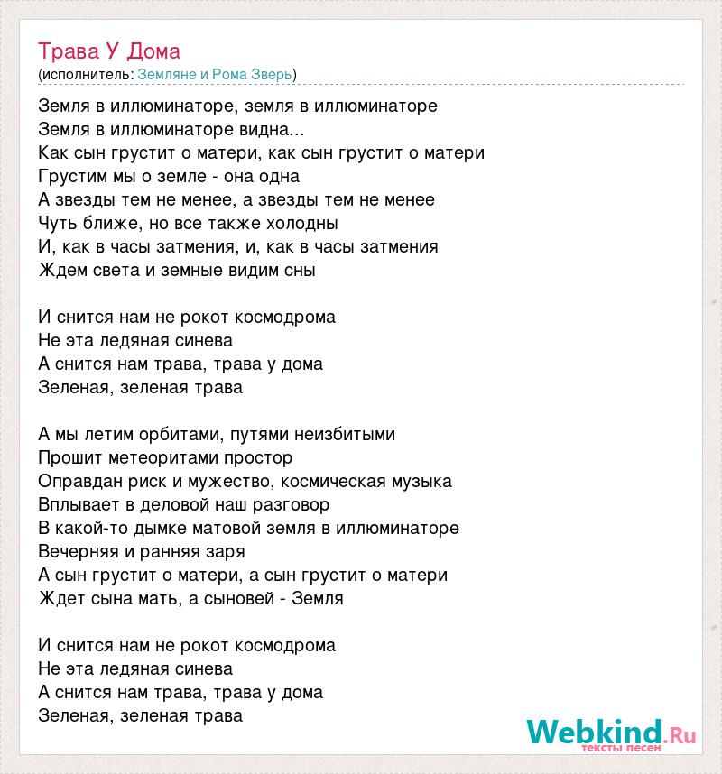 Земля в иллюминаторе, земля в иллюминаторе Земля в иллюминаторе видна... Как сын грустит о матери, как сын грустит о матери Грустим мы о земле - она одна А звезды тем не менее, а звезды тем не менее Чуть ближе, но все также холодны И, как в часы затмения, и, как в часы затмения Ждем света и земные видим сны И снится нам не рокот космодрома Не эта ледяная синева А снится нам трава, трава у дома Зеленая, зеленая трава А мы летим орбитами, путями неизбитыми Прошит метеоритами простор Оправдан риск и мужество, космическая музыка Вплывает в деловой наш разговор В какой-то дымке матовой земля в иллюминаторе Вечерняя и ранняя заря А сын грустит о матери, а сын грустит о матери Ждет сына мать, а сыновей - Земля И снится нам не рокот космодрома Не эта ледяная синева А снится нам трава, трава у дома Зеленая, зеленая трава