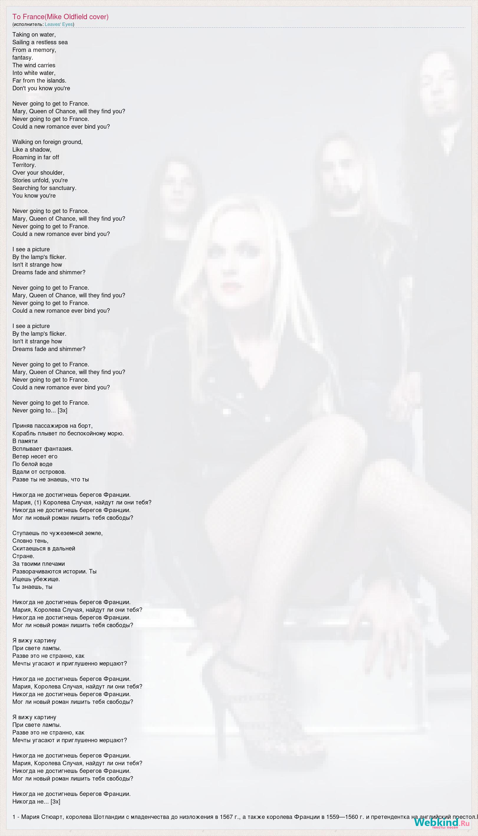Taking on water, Sailing a restless sea From a memory, fantasy. The wind carries Into white water, Far from the islands. Don't you know you're Never going to get to France. Mary, Queen of Chance, will they find you? Never going to get to France. Could a new romance ever bind you? Walking on foreign ground, Like a shadow, Roaming in far off Territory. Over your shoulder, Stories unfold, you're Searching for sanctuary. You know you're Never going to get to France. Mary, Queen of Chance, will they find you? Never going to get to France. Could a new romance ever bind you? I see a picture By the lamp's flicker. Isn't it strange how Dreams fade and shimmer? Never going to get to France. Mary, Queen of Chance, will they find you? Never going to get to France. Could a new romance ever bind you? I see a picture By the lamp's flicker. Isn't it strange how Dreams fade and shimmer? Never going to get to France. Mary, Queen of Chance, will they find you? Never going to get to France. Could a new romance ever bind you? Never going to get to France. Never going to... [3x] Приняв пассажиров на борт, Корабль плывет по беспокойному морю. В памяти Всплывает фантазия. Ветер несет его По белой воде Вдали от островов. Разве ты не знаешь, что ты Никогда не достигнешь берегов Франции. Мария, (1) Королева Случая, найдут ли они тебя? Никогда не достигнешь берегов Франции. Мог ли новый роман лишить тебя свободы? Ступаешь по чужеземной земле, Словно тень, Скитаешься в дальней Стране. За твоими плечами Разворачиваются истории. Ты Ищешь убежище. Ты знаешь, ты Никогда не достигнешь берегов Франции. Мария, Королева Случая, найдут ли они тебя? Никогда не достигнешь берегов Франции. Мог ли новый роман лишить тебя свободы? Я вижу картину При свете лампы. Разве это не странно, как Мечты угасают и приглушенно мерцают? Никогда не достигнешь берегов Франции. Мария, Королева Случая, найдут ли они тебя? Никогда не достигнешь берегов Франции. Мог ли новый роман лишить тебя свободы? Я вижу картину При свете лампы. Разве это не странно, как Мечты угасают и приглушенно мерцают? Никогда не достигнешь берегов Франции. Мария, Королева Случая, найдут ли они тебя? Никогда не достигнешь берегов Франции. Мог ли новый роман лишить тебя свободы? Никогда не достигнешь берегов Франции. Никогда не... [3x] 1 - Мария Стюарт, королева Шотландии с младенчества до низложения в 1567 г., а также королева Франции в 1559—1560 г. и претендентка на английский престол.l