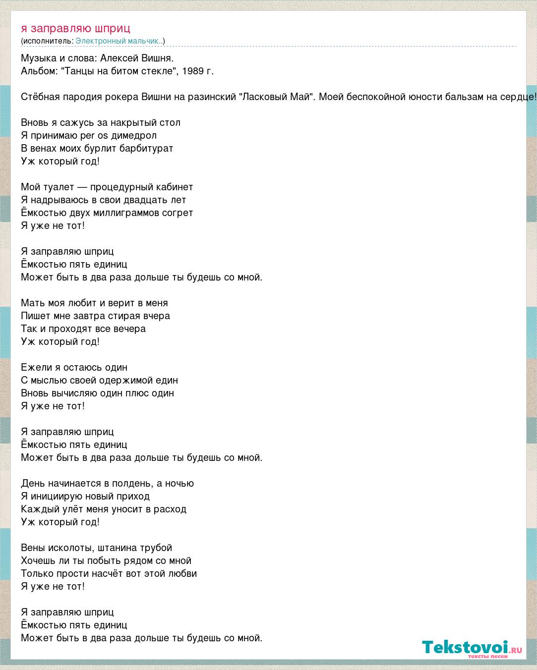Музыка и слова: Алексей Вишня. Альбом: "Танцы на битом стекле", 1989 г. Стёбная пародия рокера Вишни на разинский "Ласковый Май". Моей беспокойной юности бальзам на сердце! Вновь я сажусь за накрытый стол Я принимаю per os димедрол В венах моих бурлит барбитурат Уж который год! Мой туалет — процедурный кабинет Я надрываюсь в свои двадцать лет Ёмкостью двух миллиграммов согрет Я уже не тот! Я заправляю шприц Ёмкостью пять единиц Может быть в два раза дольше ты будешь со мной. Мать моя любит и верит в меня Пишет мне завтра стирая вчера Так и проходят все вечера Уж который год! Ежели я остаюсь один С мыслью своей одержимой един Вновь вычисляю один плюс один Я уже не тот! Я заправляю шприц Ёмкостью пять единиц Может быть в два раза дольше ты будешь со мной. День начинается в полдень, а ночью Я инициирую новый приход Каждый улёт меня уносит в расход Уж который год! Вены исколоты, штанина трубой Хочешь ли ты побыть рядом со мной Только прости насчёт вот этой любви Я уже не тот! Я заправляю шприц Ёмкостью пять единиц Может быть в два раза дольше ты будешь со мной.