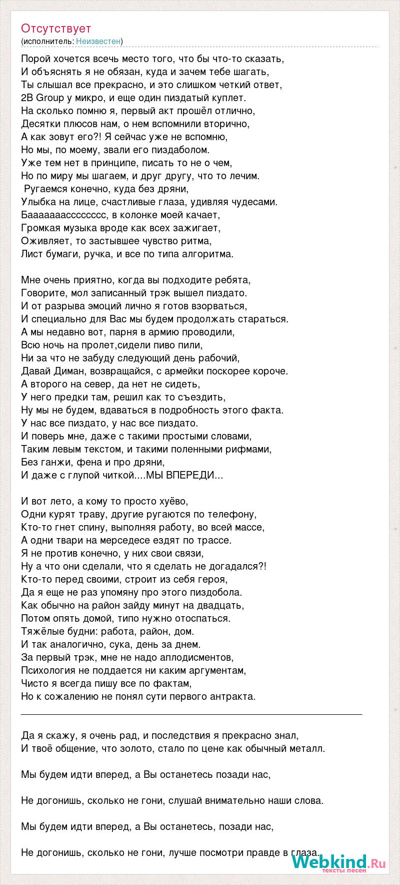 Порой хочется всечь место того, что бы что-то сказать, И объяснять я не обязан, куда и зачем тебе шагать, Ты слышал все прекрасно, и это слишком четкий ответ, 2B Group у микро, и еще один пиздатый куплет. На сколько помню я, первый акт прошёл отлично, Десятки плюсов нам, о нем вспомнили вторично, А как зовут его?! Я сейчас уже не вспомню, Но мы, по моему, звали его пиздаболом. Уже тем нет в принципе, писать то не о чем, Но по миру мы шагаем, и друг другу, что то лечим. Ругаемся конечно, куда без дряни, Улыбка на лице, счастливые глаза, удивляя чудесами. Бааааааасссссссс, в колонке моей качает, Громкая музыка вроде как всех зажигает, Оживляет, то застывшее чувство ритма, Лист бумаги, ручка, и все по типа алгоритма. Мне очень приятно, когда вы подходите ребята, Говорите, мол записанный трэк вышел пиздато. И от разрыва эмоций лично я готов взорваться, И специально для Вас мы будем продолжать стараться. А мы недавно вот, парня в армию проводили, Всю ночь на пролет,сидели пиво пили, Ни за что не забуду следующий день рабочий, Давай Диман, возвращайся, с армейки поскорее короче. А второго на север, да нет не сидеть, У него предки там, решил как то съездить, Ну мы не будем, вдаваться в подробность этого факта. У нас все пиздато, у нас все пиздато. И поверь мне, даже с такими простыми словами, Таким левым текстом, и такими поленными рифмами, Без ганжи, фена и про дряни, И даже с глупой читкой....МЫ ВПЕРЕДИ... И вот лето, а кому то просто хуёво, Одни курят траву, другие ругаются по телефону, Кто-то гнет спину, выполняя работу, во всей массе, А одни твари на мерседесе ездят по трассе. Я не против конечно, у них свои связи, Ну а что они сделали, что я сделать не догадался?! Кто-то перед своими, строит из себя героя, Да я еще не раз упомяну про этого пиздобола. Как обычно на район зайду минут на двадцать, Потом опять домой, типо нужно отоспаться. Тяжёлые будни: работа, район, дом. И так аналогично, сука, день за днем. За первый трэк, мне не надо аплодисментов, Психология не поддается ни каким аргументам, Чисто я всегда пишу все по фактам, Но к сожалению не понял сути первого антракта. ______________________________________________________________ Да я скажу, я очень рад, и последствия я прекрасно знал, И твоё общение, что золото, стало по цене как обычный металл. Мы будем идти вперед, а Вы останетесь позади нас, Не догонишь, сколько не гони, слушай внимательно наши слова. Мы будем идти вперед, а Вы останетесь, позади нас, Не догонишь, сколько не гони, лучше посмотри правде в глаза.