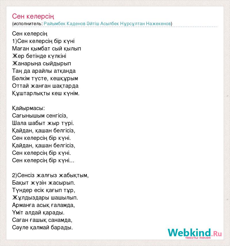 Сен келерсің 1)Сен келерсің бір күні Маған қымбат сый қылып Жер бетінде күлкіні Жанарыңа сыйдырып Таң да арайлы атқанда Бәлкім түсте, кешқұрым Оттай жанған шақтарда Құштарлықты кеш күнім. Қайырмасы: Сағынышым сенгісіз, Шала шабыт жыр түрі. Қайдан, қашан белгісіз, Сен келерсің бір күні. Қайдан, қашан белгісіз, Сен келерсің бір күні. Сен келерсің бір күні... 2)Сенсіз жалғыз жабықтым, Бақыт жүзін жасырып. Түндер есік қағып тұр, Жұлдыздары шашылып. Арманға асық ғаламда, Үміт алдай қарады. Саған ғашық санамда, Сәуле қалмай барады.