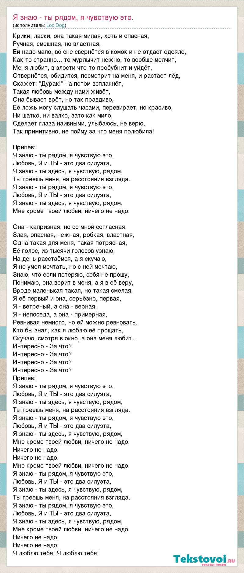 Крики, ласки, она такая милая, хоть и опасная, Ручная, смешная, но властная, Ей надо мало, во сне свернётся в комок и не отдаст одеяло, Как-то странно... то мурлычит нежно, то вообще молчит, Меня любит, в злости что-то пробубнит и уйдёт, Отвернётся, обидится, посмотрит на меня, и растает лёд, Скажет: "Дурак!" - а потом всплакнёт, Такая любовь между нами живёт, Она бывает врёт, но так правдиво, Её ложь могу слушать часами, перевирает, но красиво, Ни шатко, ни валко, зато как мило, Сделает глаза наивными, улыбаюсь, не верю, Так примитивно, не пойму за что меня полюбила! Припев: Я знаю - ты рядом, я чувствую это, Любовь, Я и ТЫ - это два силуэта, Я знаю - ты здесь, я чувствую, рядом, Ты греешь меня, на расстояния взгляда. Я знаю - ты рядом, я чувствую это, Любовь, Я и ТЫ - это два силуэта, Я знаю - ты здесь, я чувствую, рядом, Мне кроме твоей любви, ничего не надо. Она - капризная, но со мной согласная, Злая, опасная, нежная, робкая, властная, Одна такая для меня, такая потрясная, Её голос, из тысячи голосов узнаю, На день расстаёмся, а я скучаю, Я не умел мечтать, но с ней мечтаю, Знаю, что если потеряю, себя не прощу, Понимаю, она верит в меня, а я в её веру, Вроде маленькая такая, но такая смелая, Я её первый и она, серьёзно, первая, Я - ветреный, а она - верная, Я - непоседа, а она - примерная, Ревнивая немного, но ей можно ревновать, Кто бы знал, как я люблю её прощать, Скучаю, смотря в окно, а она меня любит... Интересно - За что? Интересно - За что? Интересно - За что? Интересно - За что? Припев: Я знаю - ты рядом, я чувствую это, Любовь, Я и ТЫ - это два силуэта, Я знаю - ты здесь, я чувствую, рядом, Ты греешь меня, на расстояния взгляда. Я знаю - ты рядом, я чувствую это, Любовь, Я и ТЫ - это два силуэта, Я знаю - ты здесь, я чувствую, рядом, Мне кроме твоей любви, ничего не надо. Ничего не надо. Ничего не надо. Мне кроме твоей любви, ничего не надо. Я знаю - ты рядом, я чувствую это, Любовь, Я и ТЫ - это два силуэта, Я знаю - ты здесь, я чувствую, рядом, Ты греешь меня, на расстояния взгляда. Я знаю - ты рядом, я чувствую это, Любовь, Я и ТЫ - это два силуэта, Я знаю - ты здесь, я чувствую, рядом, Мне кроме твоей любви, ничего не надо. Ничего не надо. Ничего не надо. Я люблю тебя! Я люблю тебя!