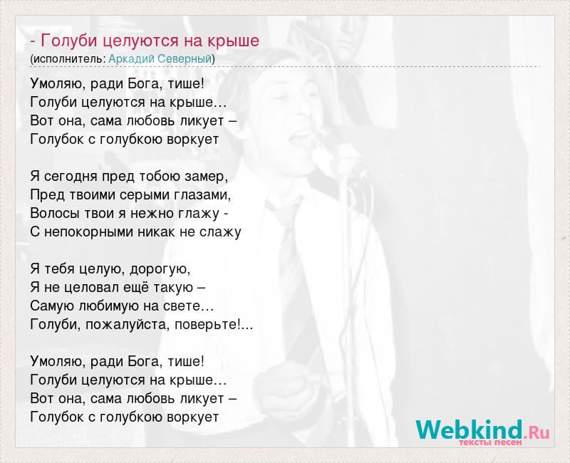 Умоляю, ради Бога, тише! Голуби целуются на крыше… Вот она, сама любовь ликует – Голубок с голубкою воркует Я сегодня пред тобою замер, Пред твоими серыми глазами, Волосы твои я нежно глажу - С непокорными никак не слажу Я тебя целую, дорогую, Я не целовал ещё такую – Самую любимую на свете… Голуби, пожалуйста, поверьте!... Умоляю, ради Бога, тише! Голуби целуются на крыше… Вот она, сама любовь ликует – Голубок с голубкою воркует