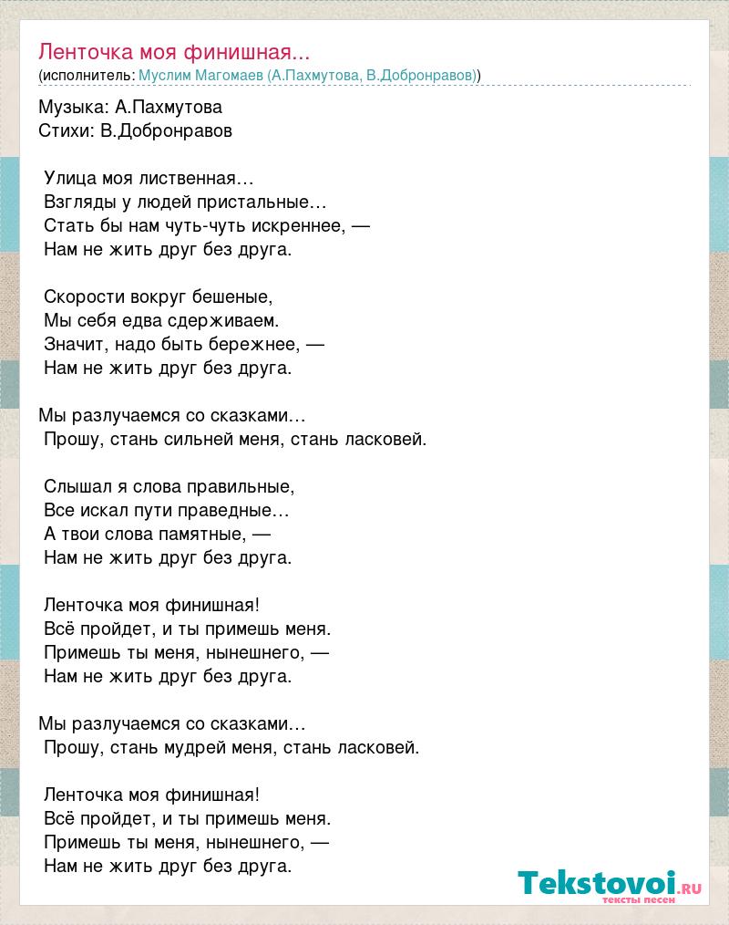 Музыка: А.Пахмутова Стихи: В.Добронравов Улица моя лиственная… Взгляды у людей пристальные… Стать бы нам чуть-чуть искреннее, — Нам не жить друг без друга. Скорости вокруг бешеные, Мы себя едва сдерживаем. Значит, надо быть бережнее, — Нам не жить друг без друга. Мы разлучаемся со сказками… Прошу, стань сильней меня, стань ласковей. Слышал я слова правильные, Все искал пути праведные… А твои слова памятные, — Нам не жить друг без друга. Ленточка моя финишная! Всё пройдет, и ты примешь меня. Примешь ты меня, нынешнего, — Нам не жить друг без друга. Мы разлучаемся со сказками… Прошу, стань мудрей меня, стань ласковей. Ленточка моя финишная! Всё пройдет, и ты примешь меня. Примешь ты меня, нынешнего, — Нам не жить друг без друга.