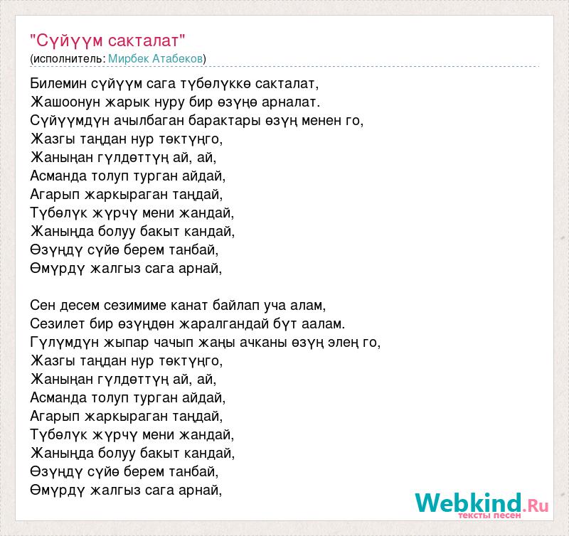 Билемин сүйүүм сага түбөлүккө сакталат, Жашоонун жарык нуру бир өзүңө арналат. Сүйүүмдүн ачылбаган барактары өзүң менен го, Жазгы таңдан нур төктүңго, Жаныңан гүлдөттүң ай, ай, Асманда толуп турган айдай, Агарып жаркыраган таңдай, Түбөлүк жүрчү мени жандай, Жаныңда болуу бакыт кандай, Өзүңдү сүйө берем танбай, Өмүрдү жалгыз сага арнай, Сен десем сезимиме канат байлап уча алам, Сезилет бир өзүңдөн жаралгандай бүт аалам. Гүлүмдүн жыпар чачып жаңы ачканы өзүң элең го, Жазгы таңдан нур төктүңго, Жаныңан гүлдөттүң ай, ай, Асманда толуп турган айдай, Агарып жаркыраган таңдай, Түбөлүк жүрчү мени жандай, Жаныңда болуу бакыт кандай, Өзүңдү сүйө берем танбай, Өмүрдү жалгыз сага арнай,