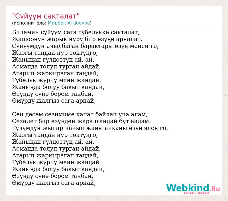 Билемин сүйүүм сага түбөлүккө сакталат, Жашоонун жарык нуру бир өзүңө арналат. Сүйүүмдүн ачылбаган барактары өзүң менен го, Жазгы таңдан нур төктүңго, Жаныңан гүлдөттүң ай, ай, Асманда толуп турган айдай, Агарып жаркыраган таңдай, Түбөлүк жүрчү мени жандай, Жаныңда болуу бакыт кандай, Өзүңдү сүйө берем танбай, Өмүрдү жалгыз сага арнай, Сен десем сезимиме канат байлап уча алам, Сезилет бир өзүңдөн жаралгандай бүт аалам. Гүлүмдүн жыпар чачып жаңы ачканы өзүң элең го, Жазгы таңдан нур төктүңго, Жаныңан гүлдөттүң ай, ай, Асманда толуп турган айдай, Агарып жаркыраган таңдай, Түбөлүк жүрчү мени жандай, Жаныңда болуу бакыт кандай, Өзүңдү сүйө берем танбай, Өмүрдү жалгыз сага арнай,