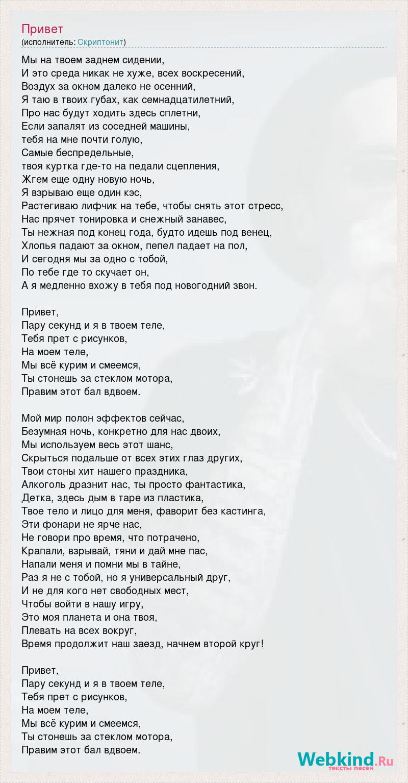 Мы на твоем заднем сидении, И это среда никак не хуже, всех воскресений, Воздух за окном далеко не осенний, Я таю в твоих губах, как семнадцатилетний, Про нас будут ходить здесь сплетни, Если запалят из соседней машины, тебя на мне почти голую, Самые беспредельные, твоя куртка где-то на педали сцепления, Жгем еще одну новую ночь, Я взрываю еще один кэс, Растегиваю лифчик на тебе, чтобы снять этот стресс, Нас прячет тонировка и снежный занавес, Ты нежная под конец года, будто идешь под венец, Хлопья падают за окном, пепел падает на пол, И сегодня мы за одно с тобой, По тебе где то скучает он, А я медленно вхожу в тебя под новогодний звон. Привет, Пару секунд и я в твоем теле, Тебя прет с рисунков, На моем теле, Мы всё курим и смеемся, Ты стонешь за стеклом мотора, Правим этот бал вдвоем. Мой мир полон эффектов сейчас, Безумная ночь, конкретно для нас двоих, Мы используем весь этот шанс, Скрыться подальше от всех этих глаз других, Твои стоны хит нашего праздника, Алкоголь дразнит нас, ты просто фантастика, Детка, здесь дым в таре из пластика, Твое тело и лицо для меня, фаворит без кастинга, Эти фонари не ярче нас, Не говори про время, что потрачено, Крапали, взрывай, тяни и дай мне пас, Напали меня и помни мы в тайне, Раз я не с тобой, но я универсальный друг, И не для кого нет свободных мест, Чтобы войти в нашу игру, Это моя планета и она твоя, Плевать на всех вокруг, Время продолжит наш заезд, начнем второй круг! Привет, Пару секунд и я в твоем теле, Тебя прет с рисунков, На моем теле, Мы всё курим и смеемся, Ты стонешь за стеклом мотора, Правим этот бал вдвоем.