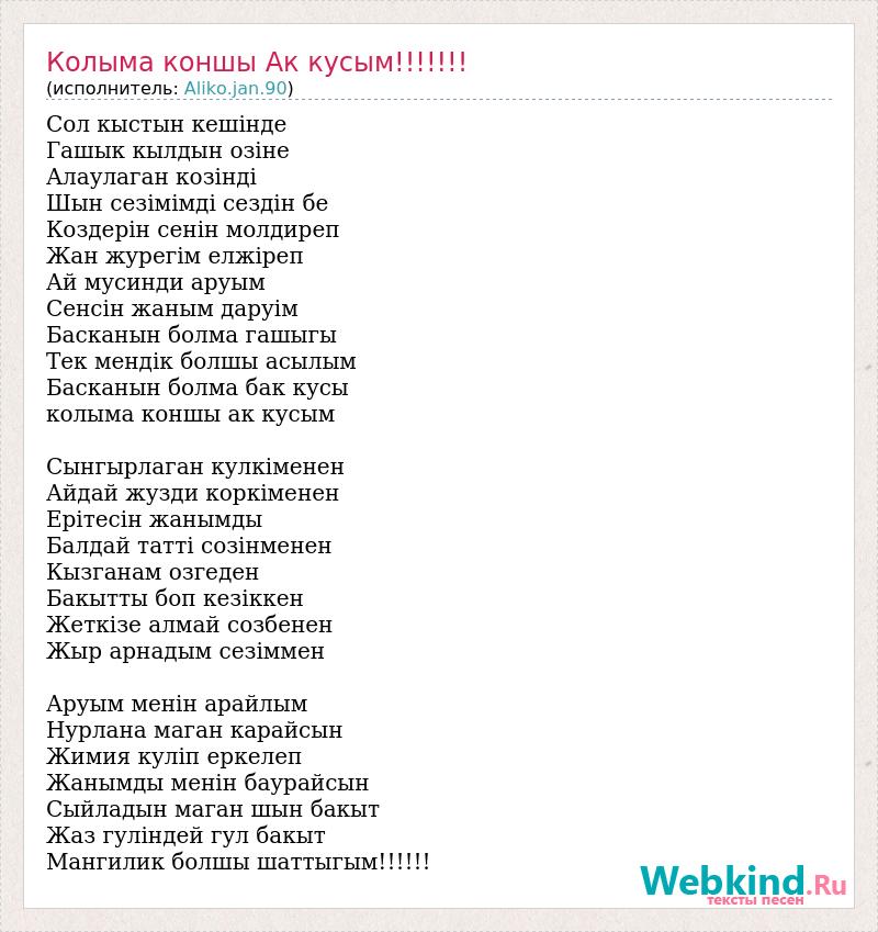 Сол кыстын кешінде Гашык кылдын озіне Алаулаган козінді Шын сезімімді сездін бе Коздерін сенін молдиреп Жан журегім елжіреп Ай мусинди аруым Сенсін жаным даруім Басканын болма гашыгы Тек мендік болшы асылым Басканын болма бак кусы колыма коншы ак кусым Сынгырлаган кулкіменен Айдай жузди коркіменен Ерітесін жанымды Балдай татті созінменен Кызганам озгеден Бакытты боп кезіккен Жеткізе алмай созбенен Жыр арнадым сезіммен Аруым менін арайлым Нурлана маган карайсын Жимия куліп еркелеп Жанымды менін баурайсын Сыйладын маган шын бакыт Жаз гуліндей гул бакыт Мангилик болшы шаттыгым!!!!!!