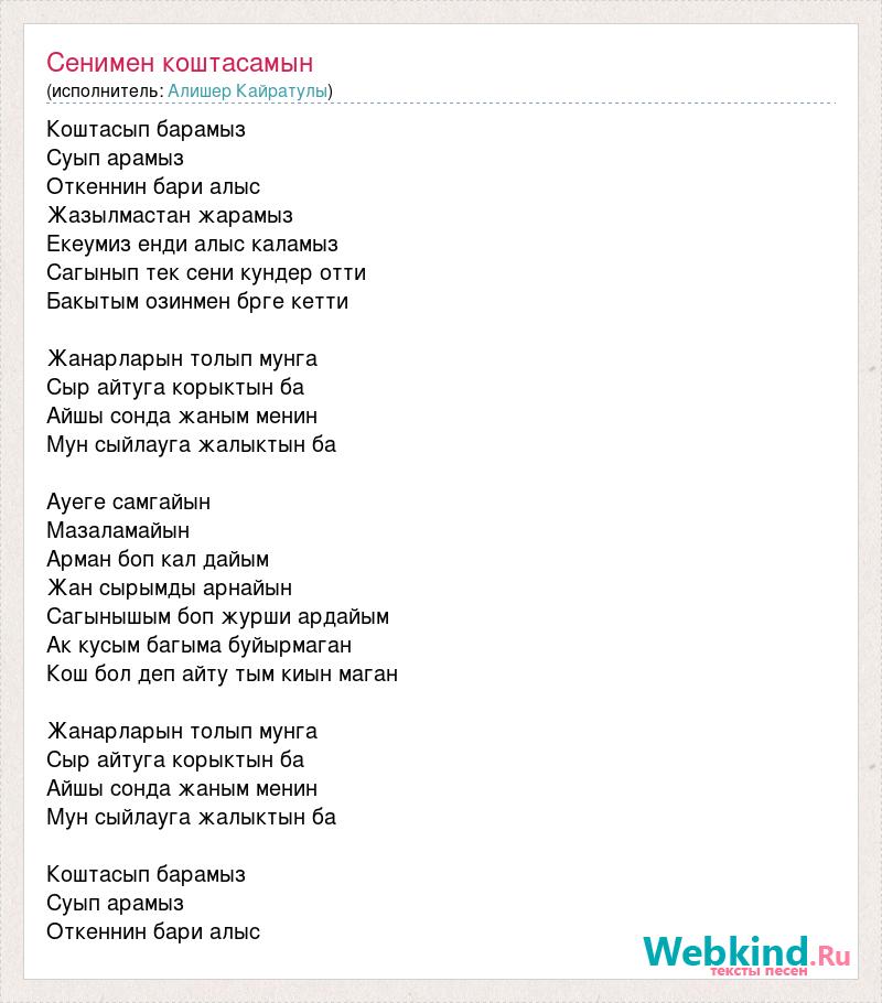 Коштасып барамыз Суып арамыз Откеннин бари алыс Жазылмастан жарамыз Екеумиз енди алыс каламыз Сагынып тек сени кундер отти Бакытым озинмен брге кетти Жанарларын толып мунга Сыр айтуга корыктын ба Айшы сонда жаным менин Мун сыйлауга жалыктын ба Ауеге самгайын Мазаламайын Арман боп кал дайым Жан сырымды арнайын Сагынышым боп журши ардайым Ак кусым багыма буйырмаган Кош бол деп айту тым киын маган Жанарларын толып мунга Сыр айтуга корыктын ба Айшы сонда жаным менин Мун сыйлауга жалыктын ба Коштасып барамыз Суып арамыз Откеннин бари алыс