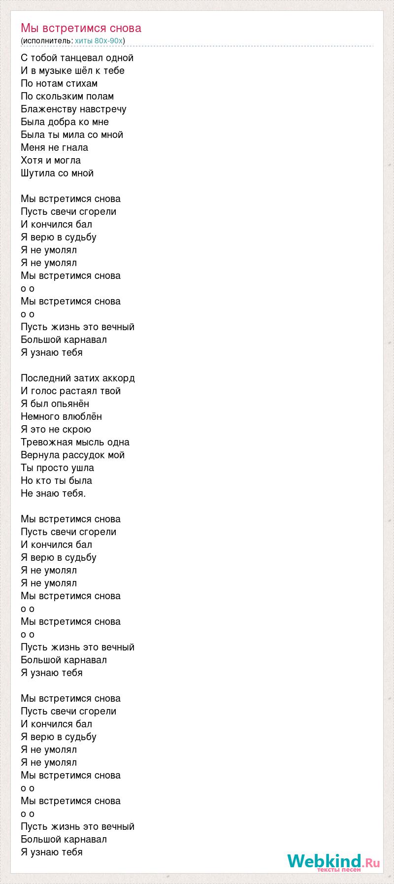 С тобой танцевал одной И в музыке шёл к тебе По нотам стихам По скользким полам Блаженству навстречу Была добра ко мне Была ты мила со мной Меня не гнала Хотя и могла Шутила со мной Мы встретимся снова Пусть свечи сгорели И кончился бал Я верю в судьбу Я не умолял Я не умолял Мы встретимся снова о о Мы встретимся снова о о Пусть жизнь это вечный Большой карнавал Я узнаю тебя Последний затих аккорд И голос растаял твой Я был опьянён Немного влюблён Я это не скрою Тревожная мысль одна Вернула рассудок мой Ты просто ушла Но кто ты была Не знаю тебя. Мы встретимся снова Пусть свечи сгорели И кончился бал Я верю в судьбу Я не умолял Я не умолял Мы встретимся снова о о Мы встретимся снова о о Пусть жизнь это вечный Большой карнавал Я узнаю тебя Мы встретимся снова Пусть свечи сгорели И кончился бал Я верю в судьбу Я не умолял Я не умолял Мы встретимся снова о о Мы встретимся снова о о Пусть жизнь это вечный Большой карнавал Я узнаю тебя
