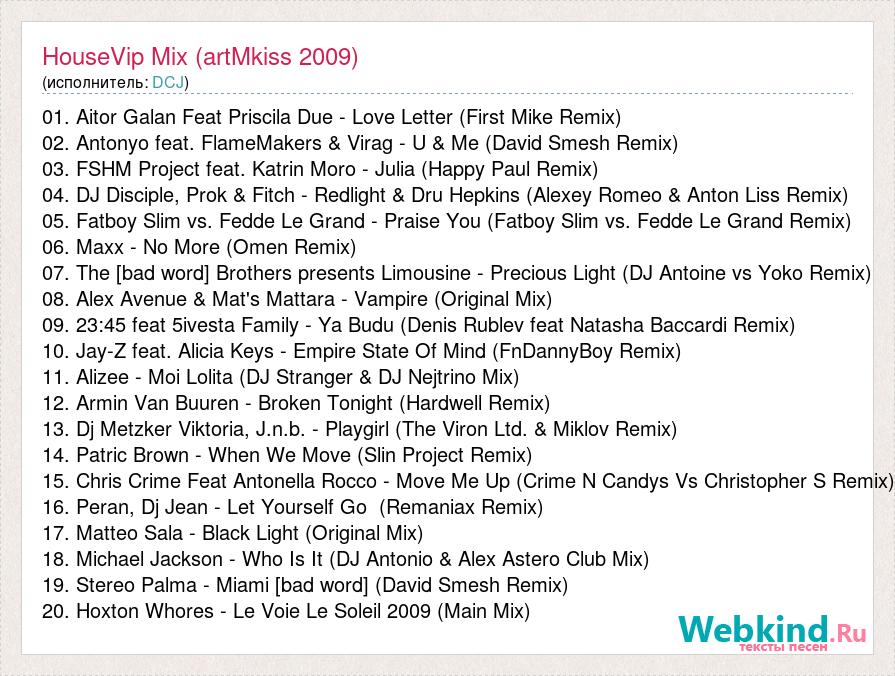 01. Aitor Galan Feat Priscila Due - Love Letter (First Mike Remix) 02. Antonyo feat. FlameMakers & Virag - U & Me (David Smesh Remix) 03. FSHM Project feat. Katrin Moro - Julia (Happy Paul Remix) 04. DJ Disciple, Prok & Fitch - Redlight & Dru Hepkins (Alexey Romeo & Anton Liss Remix) 05. Fatboy Slim vs. Fedde Le Grand - Praise You (Fatboy Slim vs. Fedde Le Grand Remix) 06. Maxx - No More (Omen Remix) 07. The [bad word] Brothers presents Limousine - Precious Light (DJ Antoine vs Yoko Remix) 08. Alex Avenue & Mat's Mattara - Vampire (Original Mix) 09. 23:45 feat 5ivesta Family - Ya Budu (Denis Rublev feat Natasha Baccardi Remix) 10. Jay-Z feat. Alicia Keys - Empire State Of Mind (FnDannyBoy Remix) 11. Alizee - Moi Lolita (DJ Stranger & DJ Nejtrino Mix) 12. Armin Van Buuren - Broken Tonight (Hardwell Remix) 13. Dj Metzker Viktoria, J.n.b. - Playgirl (The Viron Ltd. & Miklov Remix) 14. Patric Brown - When We Move (Slin Project Remix) 15. Chris Crime Feat Antonella Rocco - Move Me Up (Crime N Candys Vs Christopher S Remix) 16. Peran, Dj Jean - Let Yourself Go (Remaniax Remix) 17. Matteo Sala - Black Light (Original Mix) 18. Michael Jackson - Who Is It (DJ Antonio & Alex Astero Club Mix) 19. Stereo Palma - Miami [bad word] (David Smesh Remix) 20. Hoxton Whores - Le Voie Le Soleil 2009 (Main Mix)