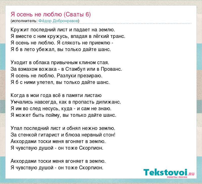 Кружит последний лист и падает на землю. Я вместе с ним кружусь, впадая в лёгкий транс. Я осень не люблю. Я слякоть не приемлю - Я б в лето убежал, вы только дайте шанс. Уходит в облака привычным клином стая. За взмахом вожака - в Стамбул или в Прованс. Я осень не люблю. Разлуки презираю. Я б с ними улетел, вы только дайте шанс. Когда в мои года всё в памяти листаю Умчались навсегда, как в пропасть дилижанс. Я им во след несусь, куда - и сам не знаю. Я может быть пойму, вы только дайте шанс. Упал последний лист и обнял нежно землю. За стенкой гитарист и блюза нервный стон! Аккордами тоски меня вгоняет в землю. Я чувствую душой - он тоже Скорпион. Аккордами тоски меня вгоняет в землю. Я чувствую душой - он тоже Скорпион.