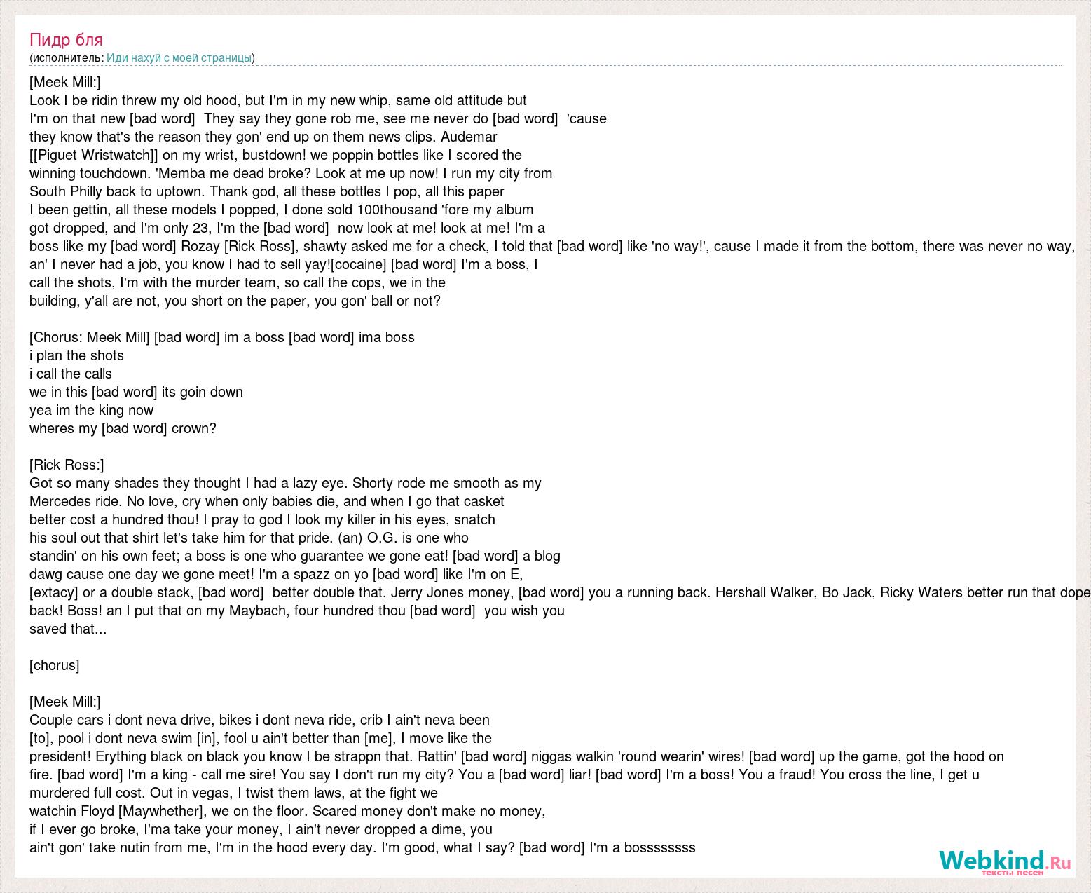 [Meek Mill:] Look I be ridin threw my old hood, but I'm in my new whip, same old attitude but I'm on that new [bad word] They say they gone rob me, see me never do [bad word] 'cause they know that's the reason they gon' end up on them news clips. Audemar [[Piguet Wristwatch]] on my wrist, bustdown! we poppin bottles like I scored the winning touchdown. 'Memba me dead broke? Look at me up now! I run my city from South Philly back to uptown. Thank god, all these bottles I pop, all this paper I been gettin, all these models I popped, I done sold 100thousand 'fore my album got dropped, and I'm only 23, I'm the [bad word] now look at me! look at me! I'm a boss like my [bad word] Rozay [Rick Ross], shawty asked me for a check, I told that [bad word] like 'no way!', cause I made it from the bottom, there was never no way, an' I never had a job, you know I had to sell yay![cocaine] [bad word] I'm a boss, I call the shots, I'm with the murder team, so call the cops, we in the building, y'all are not, you short on the paper, you gon' ball or not? [Chorus: Meek Mill] [bad word] im a boss [bad word] ima boss i plan the shots i call the calls we in this [bad word] its goin down yea im the king now wheres my [bad word] crown? [Rick Ross:] Got so many shades they thought I had a lazy eye. Shorty rode me smooth as my Mercedes ride. No love, cry when only babies die, and when I go that casket better cost a hundred thou! I pray to god I look my killer in his eyes, snatch his soul out that shirt let's take him for that pride. (an) O.G. is one who standin' on his own feet; a boss is one who guarantee we gone eat! [bad word] a blog dawg cause one day we gone meet! I'm a spazz on yo [bad word] like I'm on E, [extacy] or a double stack, [bad word] better double that. Jerry Jones money, [bad word] you a running back. Hershall Walker, Bo Jack, Ricky Waters better run that dope back! Boss! an I put that on my Maybach, four hundred thou [bad word] you wish you saved that... [chorus] [Meek Mill:] Couple cars i dont neva drive, bikes i dont neva ride, crib I ain't neva been [to], pool i dont neva swim [in], fool u ain't better than [me], I move like the president! Erything black on black you know I be strappn that. Rattin' [bad word] niggas walkin 'round wearin' wires! [bad word] up the game, got the hood on fire. [bad word] I'm a king - call me sire! You say I don't run my city? You a [bad word] liar! [bad word] I'm a boss! You a fraud! You cross the line, I get u murdered full cost. Out in vegas, I twist them laws, at the fight we watchin Floyd [Maywhether], we on the floor. Scared money don't make no money, if I ever go broke, I'ma take your money, I ain't never dropped a dime, you ain't gon' take nutin from me, I'm in the hood every day. I'm good, what I say? [bad word] I'm a bossssssss