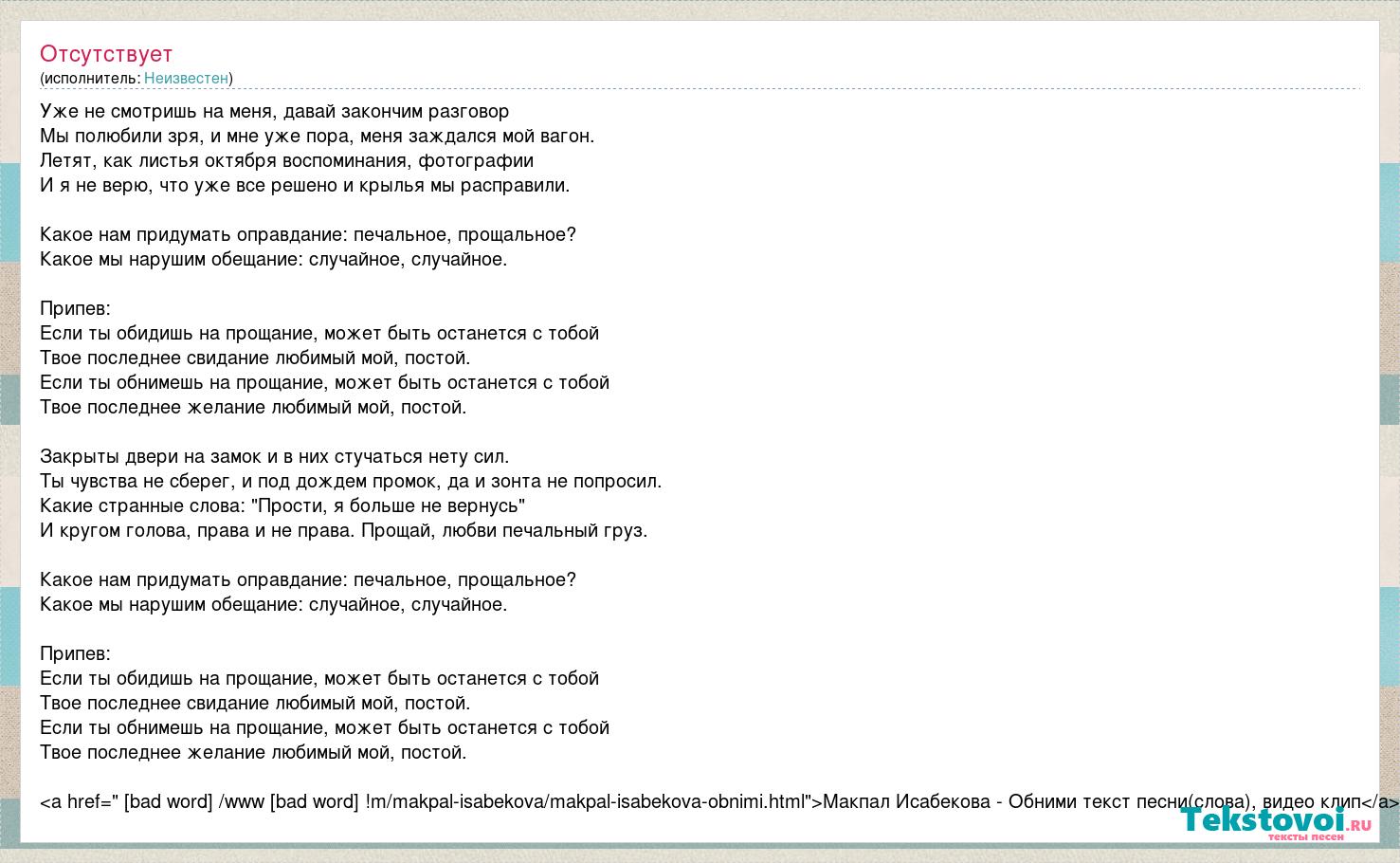 Уже не смотришь на меня, давай закончим разговор Мы полюбили зря, и мне уже пора, меня заждался мой вагон. Летят, как листья октября воспоминания, фотографии И я не верю, что уже все решено и крылья мы расправили. Какое нам придумать оправдание: печальное, прощальное? Какое мы нарушим обещание: случайное, случайное. Припев: Если ты обидишь на прощание, может быть останется с тобой Твое последнее свидание любимый мой, постой. Если ты обнимешь на прощание, может быть останется с тобой Твое последнее желание любимый мой, постой. Закрыты двери на замок и в них стучаться нету сил. Ты чувства не сберег, и под дождем промок, да и зонта не попросил. Какие странные слова: "Прости, я больше не вернусь" И кругом голова, права и не права. Прощай, любви печальный груз. Какое нам придумать оправдание: печальное, прощальное? Какое мы нарушим обещание: случайное, случайное. Припев: Если ты обидишь на прощание, может быть останется с тобой Твое последнее свидание любимый мой, постой. Если ты обнимешь на прощание, может быть останется с тобой Твое последнее желание любимый мой, постой. <a href=" [bad word] /www [bad word] !m/makpal-isabekova/makpal-isabekova-obnimi.html">Макпал Исабекова - Обними текст песни(слова), видео клип</a>