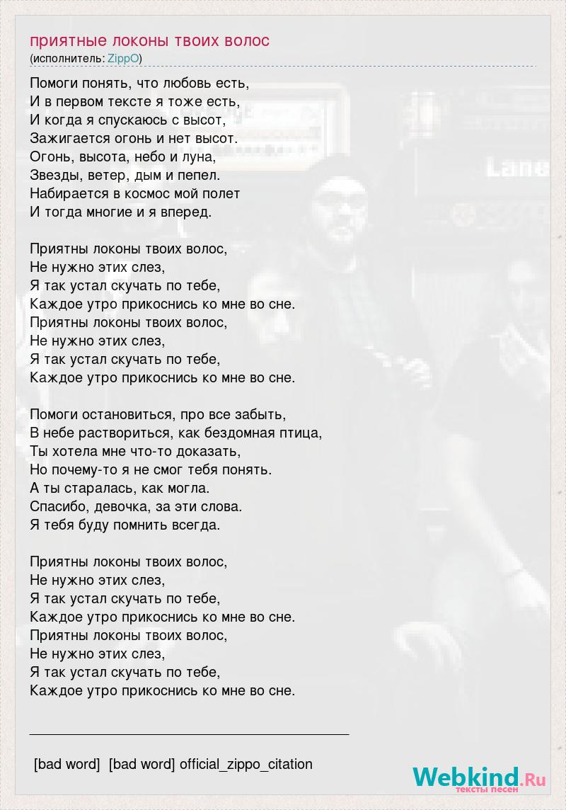 Помоги понять, что любовь есть, И в первом тексте я тоже есть, И когда я спускаюсь с высот, Зажигается огонь и нет высот. Огонь, высота, небо и луна, Звезды, ветер, дым и пепел. Набирается в космос мой полет И тогда многие и я вперед. Приятны локоны твоих волос, Не нужно этих слез, Я так устал скучать по тебе, Каждое утро прикоснись ко мне во сне. Приятны локоны твоих волос, Не нужно этих слез, Я так устал скучать по тебе, Каждое утро прикоснись ко мне во сне. Помоги остановиться, про все забыть, В небе раствориться, как бездомная птица, Ты хотела мне что-то доказать, Но почему-то я не смог тебя понять. А ты старалась, как могла. Спасибо, девочка, за эти слова. Я тебя буду помнить всегда. Приятны локоны твоих волос, Не нужно этих слез, Я так устал скучать по тебе, Каждое утро прикоснись ко мне во сне. Приятны локоны твоих волос, Не нужно этих слез, Я так устал скучать по тебе, Каждое утро прикоснись ко мне во сне. _________________________________________ [bad word] [bad word] official_zippo_citation