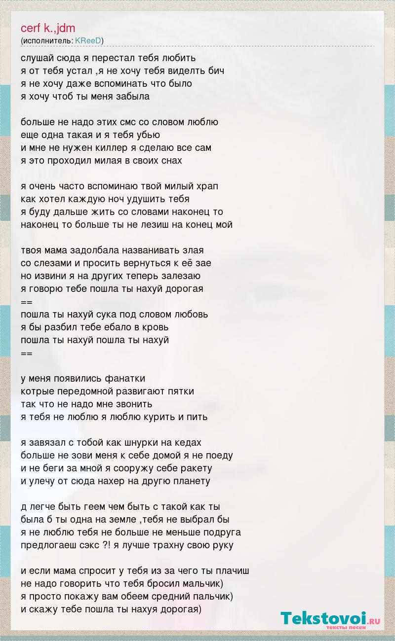 cлушай сюда я перестал тебя любить я от тебя устал ,я не хочу тебя виделть бич я не хочу даже вспоминать что было я хочу чтоб ты меня забыла больше не надо этих смс со словом люблю еще одна такая и я тебя убью и мне не нужен киллер я сделаю все сам я это проходил милая в своих снах я очень часто вспоминаю твой милый храп как хотел каждую ноч удушить тебя я буду дальше жить со словами наконец то наконец то больше ты не лезиш на конец мой твоя мама задолбала названивать злая со слезами и просить вернуться к её зае но извини я на других теперь залезаю я говорю тебе пошла ты нахуй дорогая == пошла ты нахуй сука под словом любовь я бы разбил тебе ебало в кровь пошла ты нахуй пошла ты нахуй == у меня появились фанатки котрые передомной развигают пятки так что не надо мне звонить я тебя не люблю я люблю курить и пить я завязал с тобой как шнурки на кедах больше не зови меня к себе домой я не поеду и не беги за мной я сооружу себе ракету и улечу от сюда нахер на другю планету д легче быть геем чем быть с такой как ты была б ты одна на земле ,тебя не выбрал бы я не люблю тебя не больше не меньше подруга предлогаеш сэкс ?! я лучше трахну свою руку и если мама спросит у тебя из за чего ты плачиш не надо говорить что тебя бросил мальчик) я просто покажу вам обеем средний пальчик) и скажу тебе пошла ты нахуя дорогая)