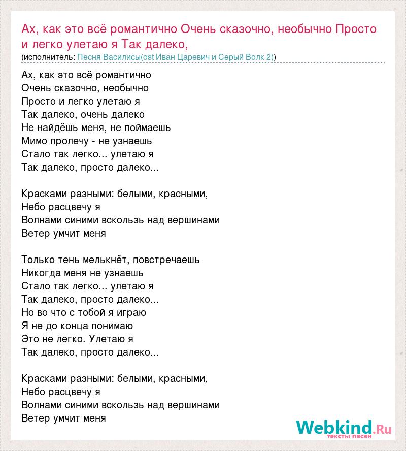 Главная→Исполнители→Песня Василисы(ost Иван Царевич и Серый Волк 2)→Ах, как это всё романтично Очень сказочно, необычно Просто и легко улетаю я