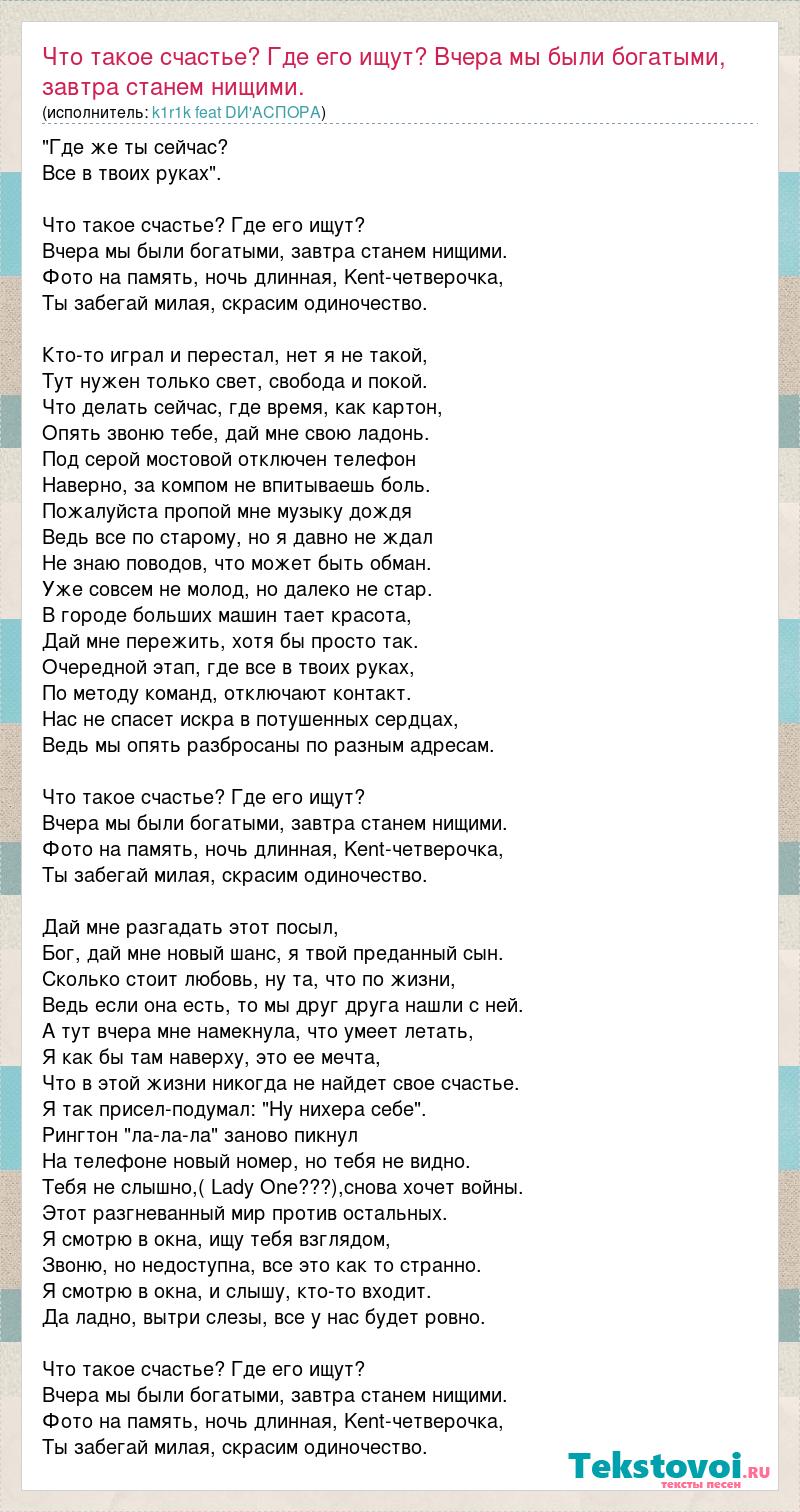 "Где же ты сейчас? Все в твоих руках". Что такое счастье? Где его ищут? Вчера мы были богатыми, завтра станем нищими. Фото на память, ночь длинная, Kent-четверочка, Ты забегай милая, скрасим одиночество. Кто-то играл и перестал, нет я не такой, Тут нужен только свет, свобода и покой. Что делать сейчас, где время, как картон, Опять звоню тебе, дай мне свою ладонь. Под серой мостовой отключен телефон Наверно, за компом не впитываешь боль. Пожалуйста пропой мне музыку дождя Ведь все по старому, но я давно не ждал Не знаю поводов, что может быть обман. Уже совсем не молод, но далеко не стар. В городе больших машин тает красота, Дай мне пережить, хотя бы просто так. Очередной этап, где все в твоих руках, По методу команд, отключают контакт. Нас не спасет искра в потушенных сердцах, Ведь мы опять разбросаны по разным адресам. Что такое счастье? Где его ищут? Вчера мы были богатыми, завтра станем нищими. Фото на память, ночь длинная, Kent-четверочка, Ты забегай милая, скрасим одиночество. Дай мне разгадать этот посыл, Бог, дай мне новый шанс, я твой преданный сын. Сколько стоит любовь, ну та, что по жизни, Ведь если она есть, то мы друг друга нашли с ней. А тут вчера мне намекнула, что умеет летать, Я как бы там наверху, это ее мечта, Что в этой жизни никогда не найдет свое счастье. Я так присел-подумал: "Ну нихера себе". Рингтон "ла-ла-ла" заново пикнул На телефоне новый номер, но тебя не видно. Тебя не слышно,( Lady One???),снова хочет войны. Этот разгневанный мир против остальных. Я смотрю в окна, ищу тебя взглядом, Звоню, но недоступна, все это как то странно. Я смотрю в окна, и слышу, кто-то входит. Да ладно, вытри слезы, все у нас будет ровно. Что такое счастье? Где его ищут? Вчера мы были богатыми, завтра станем нищими. Фото на память, ночь длинная, Kent-четверочка, Ты забегай милая, скрасим одиночество.