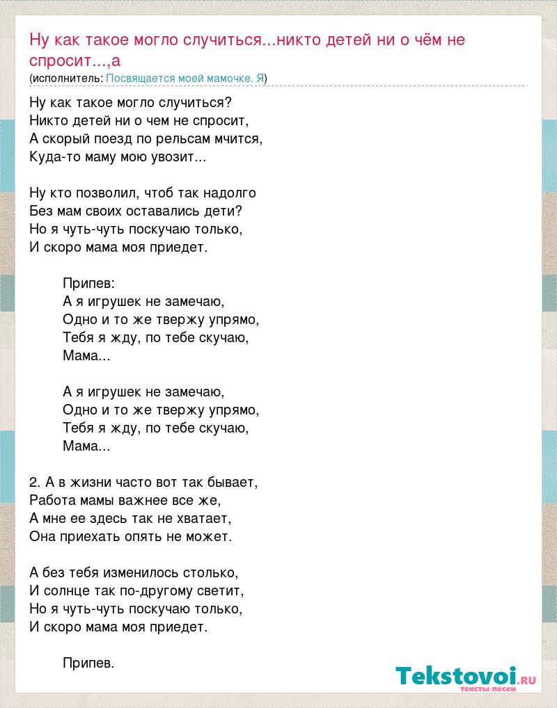 Главная→Исполнители→Посвящается моей мамочке. Я всегда буду тебя помнить и любить. Мне тебя очень не хватает.→Ну как такое могло случиться...никто детей ни о чём не спросит...,а скорый п