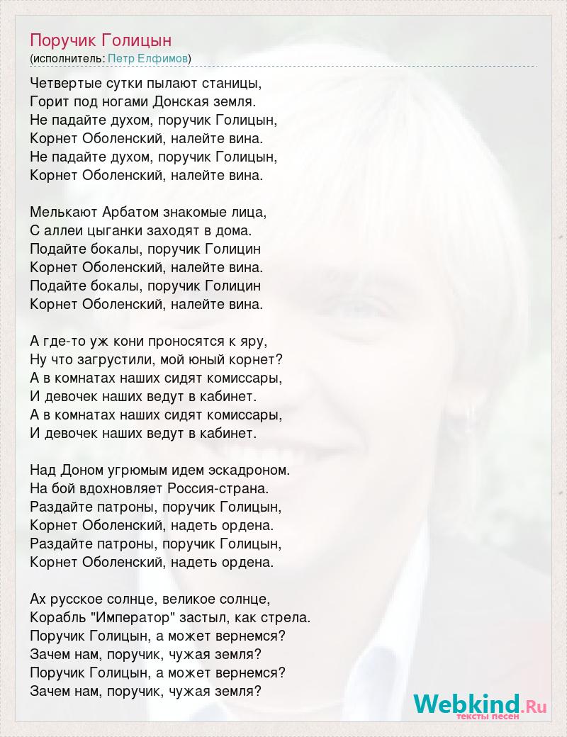 Четвертые сутки пылают станицы, Горит под ногами Донская земля. Не падайте духом, поручик Голицын, Корнет Оболенский, налейте вина. Не падайте духом, поручик Голицын, Корнет Оболенский, налейте вина. Мелькают Арбатом знакомые лица, С аллеи цыганки заходят в дома. Подайте бокалы, поручик Голицин Корнет Оболенский, налейте вина. Подайте бокалы, поручик Голицин Корнет Оболенский, налейте вина. А где-то уж кони проносятся к яру, Ну что загрустили, мой юный корнет? А в комнатах наших сидят комиссары, И девочек наших ведут в кабинет. А в комнатах наших сидят комиссары, И девочек наших ведут в кабинет. Над Доном угрюмым идем эскадроном. На бой вдохновляет Россия-страна. Раздайте патроны, поручик Голицын, Корнет Оболенский, надеть ордена. Раздайте патроны, поручик Голицын, Корнет Оболенский, надеть ордена. Ах русское солнце, великое солнце, Корабль "Император" застыл, как стрела. Поручик Голицын, а может вернемся? Зачем нам, поручик, чужая земля? Поручик Голицын, а может вернемся? Зачем нам, поручик, чужая земля?