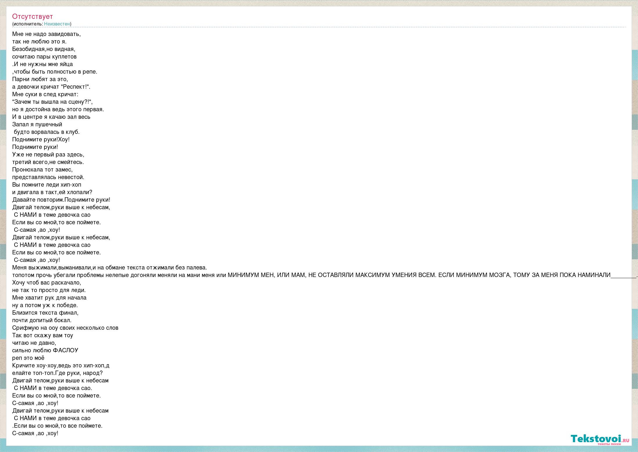 Мне не надо завидовать, так не люблю это я. Безобидная,но видная, сочитаю пары куплетов .И не нужны мне яйца ,чтобы быть полностью в репе. Парни любят за это, а девочки кричат "Респект!". Мне суки в след кричат: "Зачем ты вышла на сцену?!", но я достойна ведь этого первая. И в центре я качаю зал весь Запал я пушечный будто ворвалась в клуб. Поднимите руки!Хоу! Поднимите руки! Уже не первый раз здесь, третий всего,не смейтесь. Пронюхала тот замес, представлялась невестой. Вы помните леди хип-хоп и двигала в такт,ей хлопали? Давайте повторим.Поднимите руки! Двигай телом,руки выше к небесам, С НАМИ в теме девочка сао Если вы со мной,то все поймете. С-самая ,ао ,хоу! Двигай телом,руки выше к небесам, С НАМИ в теме девочка сао Если вы со мной,то все поймете. С-самая ,ао ,хоу! Меня выжимали,выманивали,и на обмане текста отжимали без палева. топотом прочь убегали проблемы нелепые догоняли меняли на мани меня или МИНИМУМ МЕН, ИЛИ МАМ, НЕ ОСТАВЛЯЛИ МАКСИМУМ УМЕНИЯ ВСЕМ. ЕСЛИ МИНИМУМ МОЗГА, ТОМУ ЗА МЕНЯ ПОКА НАМИНАЛИ________. Хочу чтоб вас раскачало, не так то просто для леди. Мне хватит рук для начала ну а потом уж к победе. Близится текста финал, почти допитый бокал. Срифмую на ооу своих несколько слов Так вот скажу вам тоу читаю не давно, сильно люблю ФАСЛОУ реп это моё Кричите хоу-хоу,ведь это хип-хоп,д елайте топ-топ.Где руки, народ? Двигай телом,руки выше к небесам С НАМИ в теме девочка сао. Если вы со мной,то все поймете. С-самая ,ао ,хоу! Двигай телом,руки выше к небесам С НАМИ в теме девочка сао .Если вы со мной,то все поймете. С-самая ,ао ,хоу!