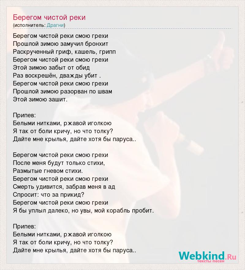 Берегом чистой реки смою грехи Прошлой зимою замучил бронхит Раскрученный гриф, кашель, грипп Берегом чистой реки смою грехи Этой зимою забыт от обид Раз воскрешён, дважды убит . Берегом чистой реки смою грехи Прошлой зимою разорван по швам Этой зимою зашит. Припев: Белыми нитками, ржавой иголкою Я так от боли кричу, но что толку? Дайте мне крылья, дайте хотя бы паруса.. Берегом чистой реки смою грехи После меня будут только стихи, Размытые гневом стихи. Берегом чистой реки смою грехи Смерть удивится, забрав меня в ад Спросит: что за прикид? Берегом чистой реки смою грехи Я бы уплыл далеко, но увы, мой корабль пробит. Припев: Белыми нитками, ржавой иголкою Я так от боли кричу, но что толку? Дайте мне крылья, дайте хотя бы паруса..