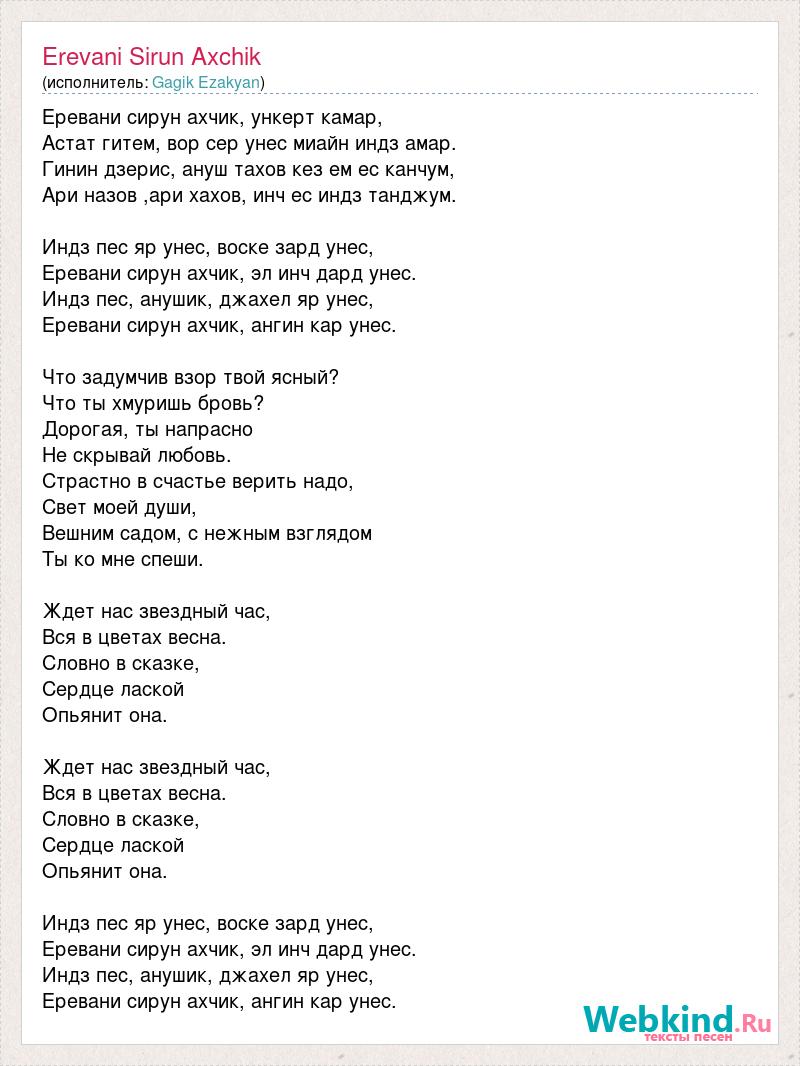 Еревани сирун ахчик, ункерт камар, Астат гитем, вор сер унес миайн индз амар. Гинин дзерис, ануш тахов кез ем ес канчум, Ари назов ,ари хахов, инч ес индз танджум. Индз пес яр унес, воске зард унес, Еревани сирун ахчик, эл инч дард унес. Индз пес, анушик, джахел яр унес, Еревани сирун ахчик, ангин кар унес. Что задумчив взор твой ясный? Что ты хмуришь бровь? Дорогая, ты напрасно Не скрывай любовь. Страстно в счастье верить надо, Свет моей души, Вешним садом, с нежным взглядом Ты ко мне спеши. Ждет нас звездный час, Вся в цветах весна. Словно в сказке, Сердце лаской Опьянит она. Ждет нас звездный час, Вся в цветах весна. Словно в сказке, Сердце лаской Опьянит она. Индз пес яр унес, воске зард унес, Еревани сирун ахчик, эл инч дард унес. Индз пес, анушик, джахел яр унес, Еревани сирун ахчик, ангин кар унес.