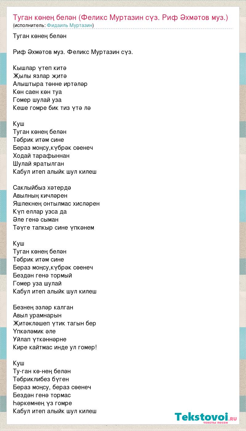 Туган көнең белән Риф Әхмәтов муз. Феликс Муртазин сүз. Кышлар үтеп китә Җылы язлар җитә Алыштыра төнне иртәләр Көн саен көн туа Гомер шулай уза Кеше гомре бик тиз үтә лә Куш Туган көнең белән Тәбрик итәм сине Бераз моңсу,күбрәк сөенеч Ходай тарафыннан Шулай яратылган Кабул итеп алыйк шул килеш Саклыйбыз хәтердә Авылның кичләрен Яшлекнең онтылмас хисләрен Күп еллар узса да Әле генә сыман Тәүге тапкыр сине үпкәнем Куш Туган көнең белән Тәбрик итәм сине Бераз моңсу,күбрәк сөенеч Бездән генә тормый Гомер уза шулай Кабул итеп алыйк шул килеш Безнең эзләр калган Авыл урамнарын Җитәкләшеп үтик тагын бер Үпкәләмик әле Уйлап үткәннәрне Кире кайтмас инде ул гомер! Куш Ту-ган кө-нең белән Тәбриклибез бүген Бераз моңсу, бераз сөенеч Бездән генә тормас Һәркемнең үз гомре Кабул итеп алыйк шул килеш