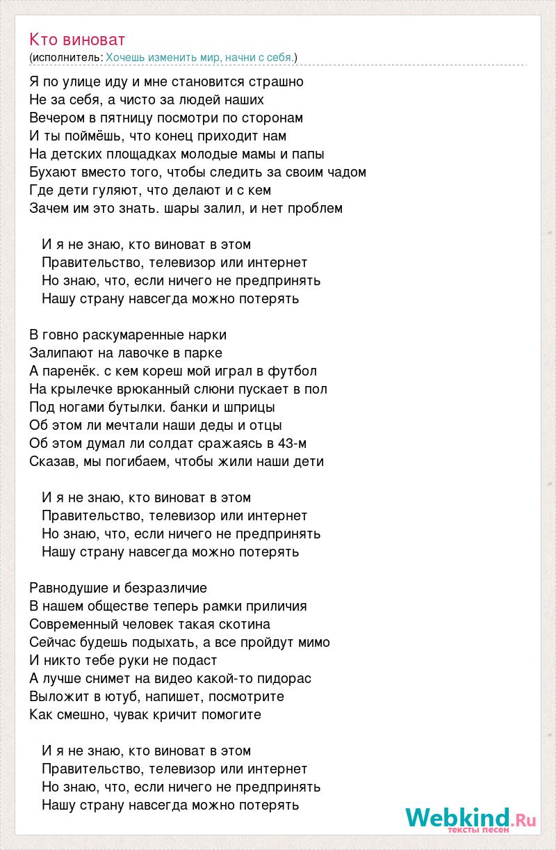 Я по улице иду и мне становится страшно Не за себя, а чисто за людей наших Вечером в пятницу посмотри по сторонам И ты поймёшь, что конец приходит нам На детских площадках молодые мамы и папы Бухают вместо того, чтобы следить за своим чадом Где дети гуляют, что делают и с кем Зачем им это знать. шары залил, и нет проблем И я не знаю, кто виноват в этом Правительство, телевизор или интернет Но знаю, что, если ничего не предпринять Нашу страну навсегда можно потерять В говно раскумаренные нарки Залипают на лавочке в парке А паренёк. с кем кореш мой играл в футбол На крылечке врюканный слюни пускает в пол Под ногами бутылки. банки и шприцы Об этом ли мечтали наши деды и отцы Об этом думал ли солдат сражаясь в 43-м Сказав, мы погибаем, чтобы жили наши дети И я не знаю, кто виноват в этом Правительство, телевизор или интернет Но знаю, что, если ничего не предпринять Нашу страну навсегда можно потерять Равнодушие и безразличие В нашем обществе теперь рамки приличия Современный человек такая скотина Сейчас будешь подыхать, а все пройдут мимо И никто тебе руки не подаст А лучше снимет на видео какой-то пидорас Выложит в ютуб, напишет, посмотрите Как смешно, чувак кричит помогите И я не знаю, кто виноват в этом Правительство, телевизор или интернет Но знаю, что, если ничего не предпринять Нашу страну навсегда можно потерять