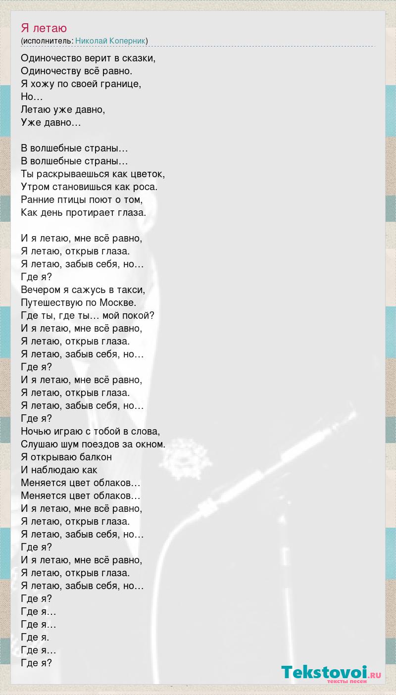 Одиночество верит в сказки, Одиночеству всё равно. Я хожу по своей границе, Но… Летаю уже давно, Уже давно… В волшебные страны… В волшебные страны… Ты раскрываешься как цветок, Утром становишься как роса. Ранние птицы поют о том, Как день протирает глаза. И я летаю, мне всё равно, Я летаю, открыв глаза. Я летаю, забыв себя, но… Где я? Вечером я сажусь в такси, Путешествую по Москве. Где ты, где ты… мой покой? И я летаю, мне всё равно, Я летаю, открыв глаза. Я летаю, забыв себя, но… Где я? И я летаю, мне всё равно, Я летаю, открыв глаза. Я летаю, забыв себя, но… Где я? Ночью играю с тобой в слова, Слушаю шум поездов за окном. Я открываю балкон И наблюдаю как Меняется цвет облаков… Меняется цвет облаков… И я летаю, мне всё равно, Я летаю, открыв глаза. Я летаю, забыв себя, но… Где я? И я летаю, мне всё равно, Я летаю, открыв глаза. Я летаю, забыв себя, но… Где я? Где я… Где я… Где я. Где я… Где я?