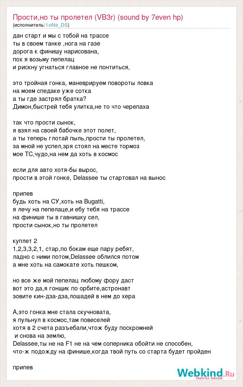 дан старт и мы с тобой на трассе ты в своем танке ,нога на газе дорога к финишу нарисована, пох я возьму пепелац и рискну угнаться главное не понтиться, это тройная гонка, маневрируем повороты ловка на моем спедаке уже сотка а ты где застрял братка? Димон,быстрей тебя улитка,не то что черепаха так что прости сынок, я взял на своей бабочке этот полет, а ты теперь глотай пыль,прости ты пролетел, за мной не успел,зря стоял на месте тормоз мое ТС,чудо,на нем да хоть в космос если для авто хотя-бы вырос, прости в этой гонке, Delassee ты стартовал на вынос припев будь хоть на СУ,хоть на Bugatti, я лечу на пепелаце,и ебу тебя на трассе на финише ты в гавнишку сел, прости сынок,но ты пролетел куплет 2 1,2,3,3,2,1, стар,по бокам еще пару ребят, ладно с ними потом,Delassee облился потом а мне хоть на самокате хоть пешком, но все же мой пепелац любому фору даст вот это да,я гонщик по орбите,астронавт зовите кин-дза-дза,лошадей в нем до хера А,это гонка мне стала скучновата, я пульнул в космос,там повеселей хотя в 2 счета разъебали,чтож буду поскромней и снова на землю, Delassee,ты не на F1 не на чем соперника обойти не способен, что-ж подожду на финише,когда твой путь со старта будет пройден припев