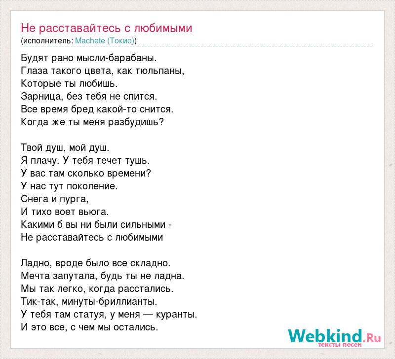 Будят рано мысли-барабаны. Глаза такого цвета, как тюльпаны, Которые ты любишь. Зарница, без тебя не спится. Все время бред какой-то снится. Когда же ты меня разбудишь? Твой душ, мой душ. Я плачу. У тебя течет тушь. У вас там сколько времени? У нас тут поколение. Снега и пурга, И тихо воет вьюга. Какими б вы ни были сильными - Не расставайтесь с любимыми Ладно, вроде было все складно. Мечта запутала, будь ты не ладна. Мы так легко, когда расстались. Тик-так, минуты-бриллианты. У тебя там статуя, у меня — куранты. И это все, с чем мы остались.