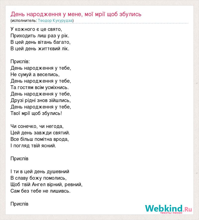 У кожного є це свято, Приходить лиш раз у рік. В цей день вітань багато, В цей день життєвий лік. Приспів: День народження у тебе, Не сумуй а веселись, День народження у тебе, Та гостям всім усміхнись. День народження у тебе, Друзі рідні знов зійшлись, День народження у тебе, Твої мрії щоб збулись! Чи сонечко, чи негода, Цей день завжди святий. Все більш помітна врода, І погляд твій ясний. Приспів І ти в цей день душевний В славу божу помолись, Щоб твій Ангел вірний, ревний, Сам без тебе не лишивсь. Приспів